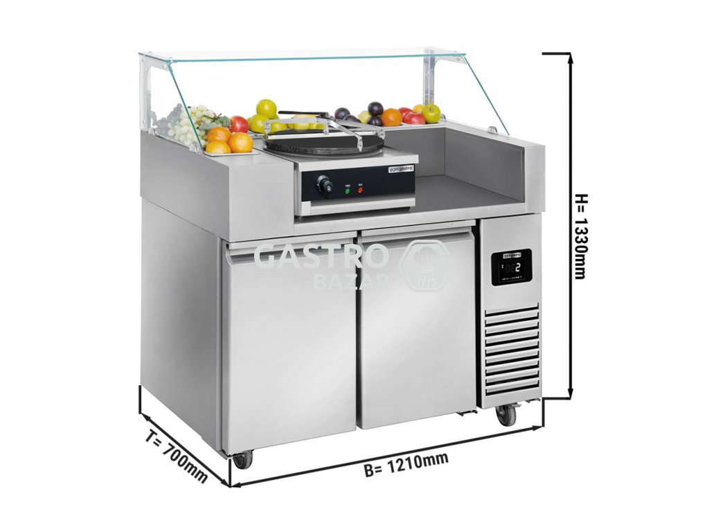 All in One vozík 1,21 x 0,7 m - se dvěma dveřmi - včetně zařízení na výrobu palačinek s 1 deskou a rozdělovačem těsta