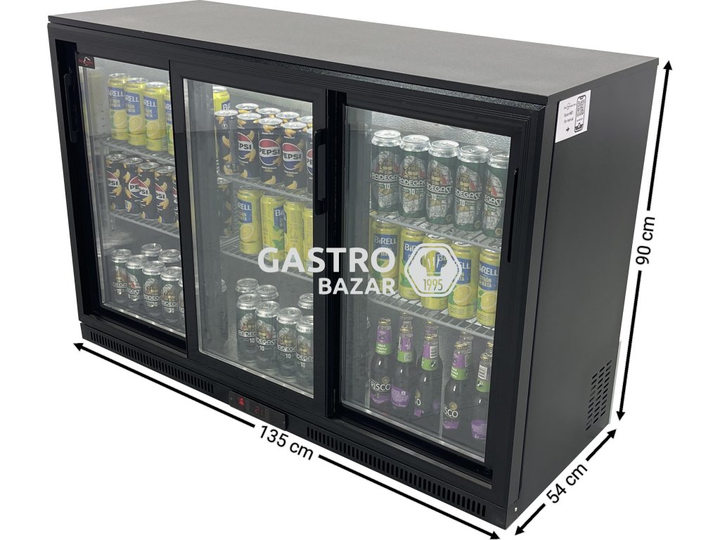 Barová lednice - 1350 x 540 x 900 mm, se 3 skleněnými dveřmi a 2 policemi - černá