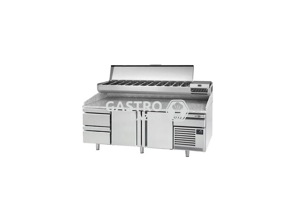 Refrigerated Pizza Prep Counter PREMIUM – Granite Top – 2 Doors – 2305×800 mm – with Stainless Display Unit (2–6°C)