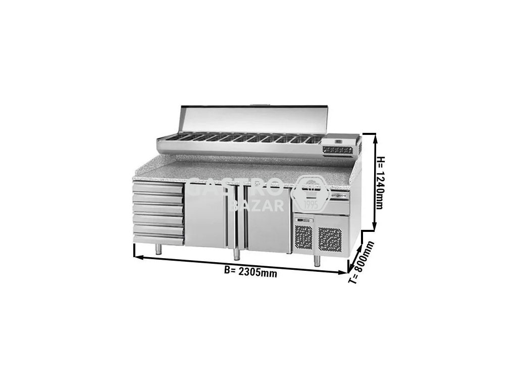 Commercial Refrigerated Pizza Prep Counter Premium PLUS - 2305x800 - 2 Doors - 6 Drawers - Top Display Rail - 11x GN 1/4