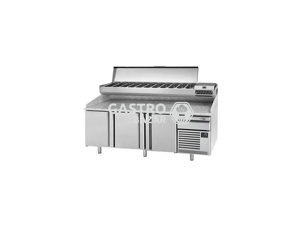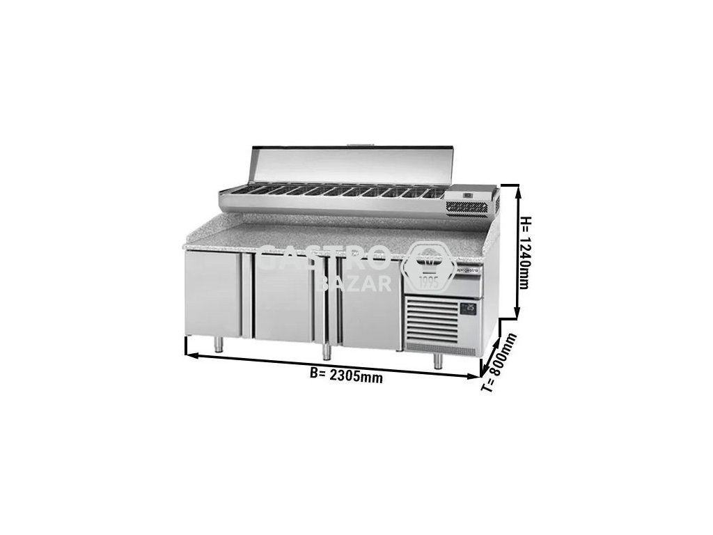 Commercial Refrigerated Pizza Prep Counter Premium PLUS - 2305x800 - 3 Doors - Top Display Rail - 11x GN 1/4