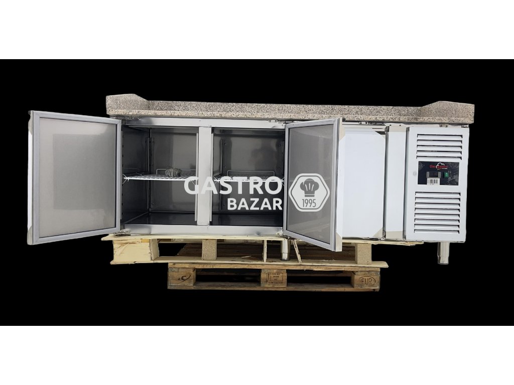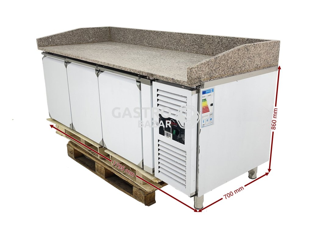 Profesionální chladicí stůl na pizzu s objemem 560 l a žulovou pracovní deskou se zadním lemem. Ideální řešení pro pizzerie a gastro provozy, kde je potřeba spojit přípravu surovin a jejich chlazené skladování. Zařízení nabízí elektronické ovládání s digitálním displejem, výkonný chladicí systém a snadnou údržbu díky nerezovému provedení.