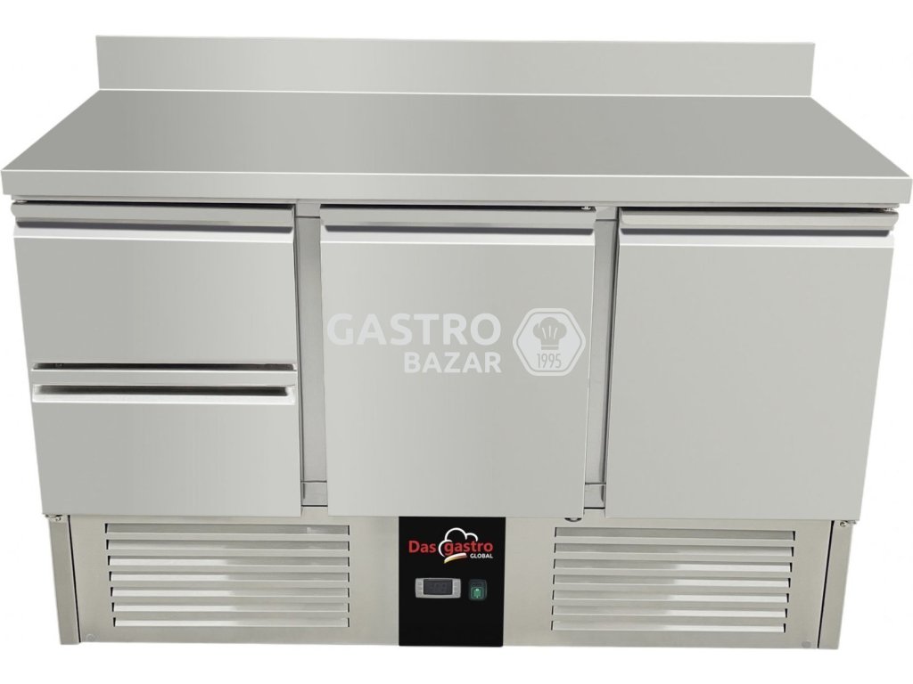 Chladící stůl / přípravný stůl 1,37 mx 0,7 m - se 2 dveřmi a 2 šuplíky v levo a zadním lemem
