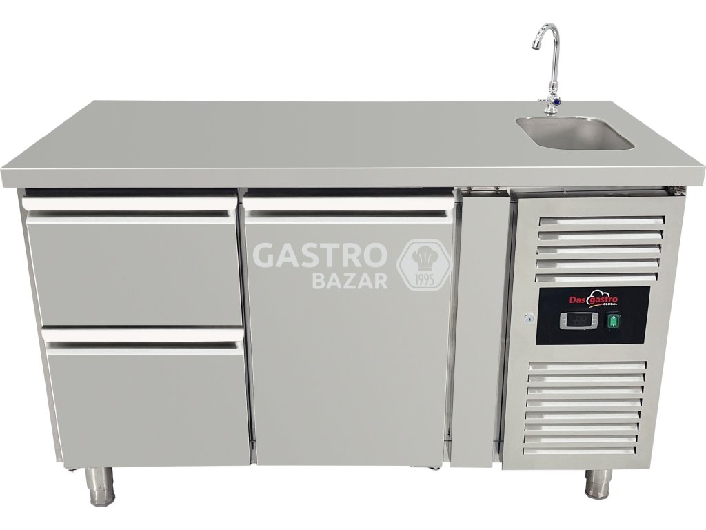 Kompaktní chladicí stůl s pracovní plochou a integrovaným dřezem – ideální do menších profesionálních kuchyní