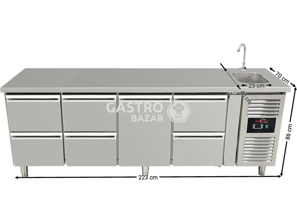 Chladicí stůl s dřezem - 6 zásuvek a dvířky prostřední vlevo