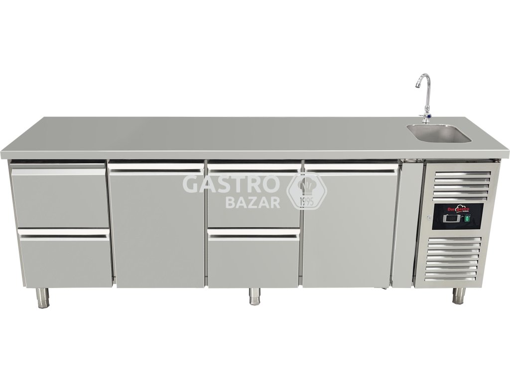 Chladicí stůl s dřezem se 2 dvířky a 4 šuplíky střídavě vlevo