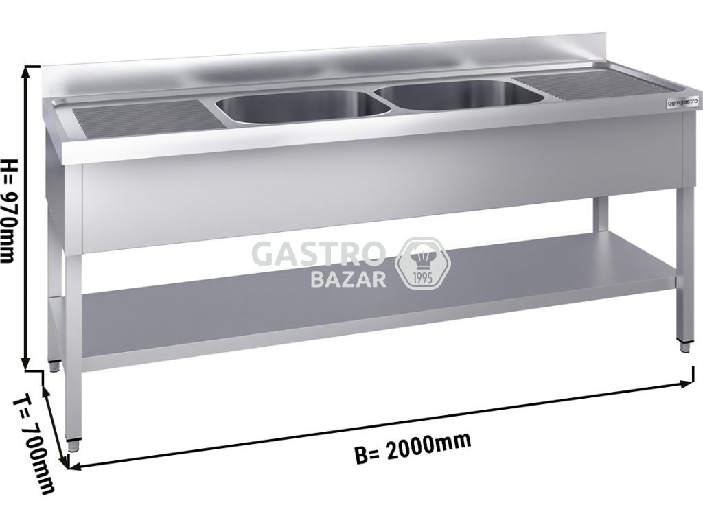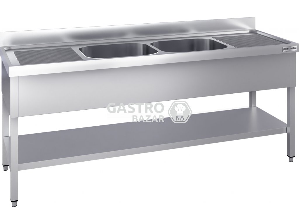 Dřez nerezový s policí 2,0 m, 2 dřez uprostřed, hloubka 70 cm