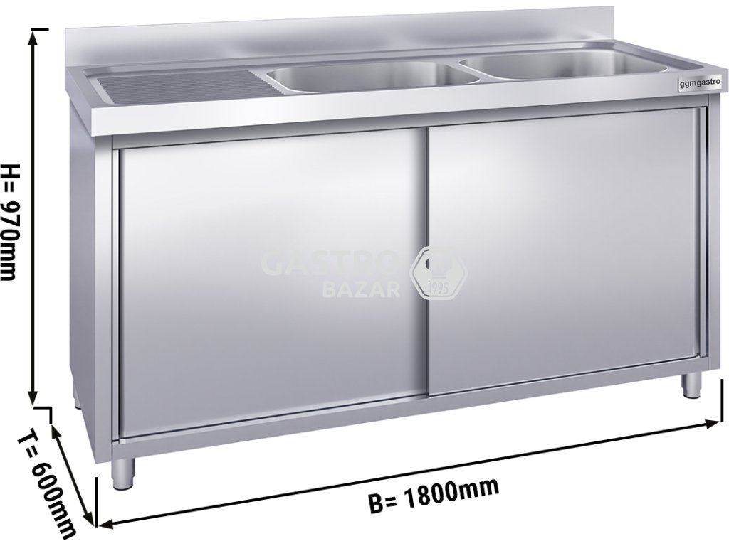 Dřez nerezový s posuvnými dveřmi 1,8 m, 2 dřezy vpravo, hloubka 60 cm