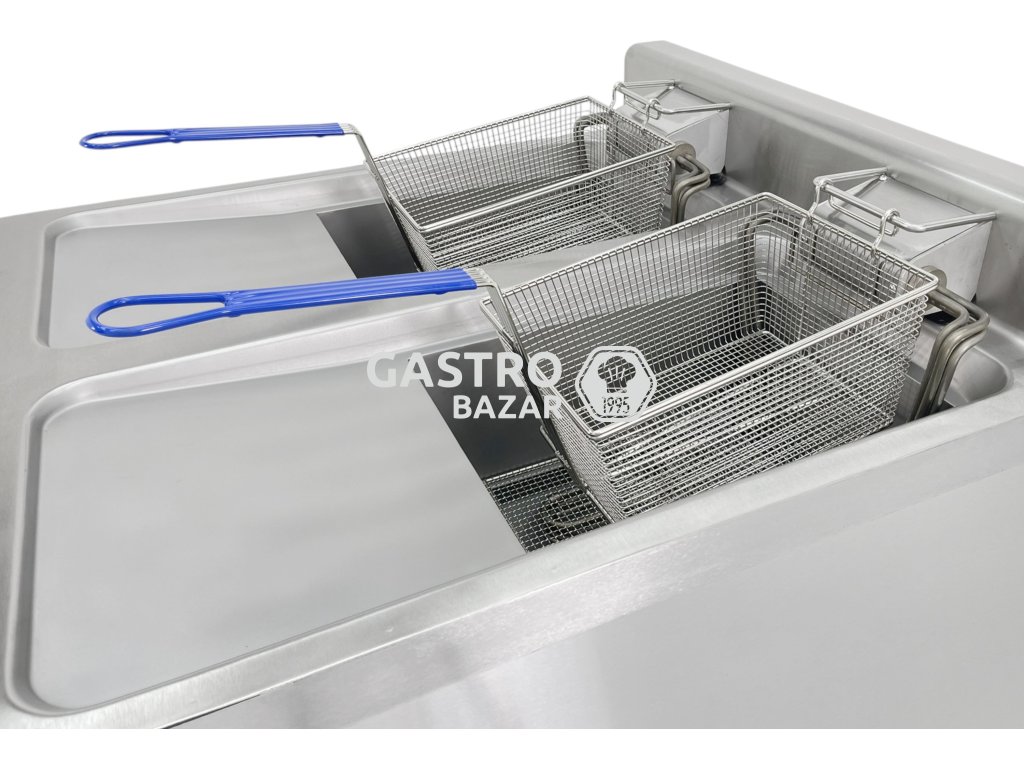 Dvounádobová elektrická fritéza se skříní je profesionální zařízení určené pro gastro provozy s vysokou kapacitou – restaurace, jídelny, bistra, fast foody či provozy rychlé obsluhy. Umožňuje současné fritování dvou různých druhů pokrmů bez promíchání chutí a díky dvěma samostatným nádržím výrazně zvyšuje průchodnost kuchyně.