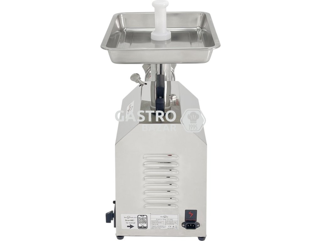 Robustní nerezová konstrukce snese každodenní zátěž v profesionální kuchyni i řeznictví a zároveň se snadno čistí – hladký leštěný povrch omezuje ulpívání zbytků masa. Funkce zpětného chodu snižuje riziko zablokování šneku při větších kusech či tučnějším mase, takže není potřeba zdlouhavé rozebírání stroje.
