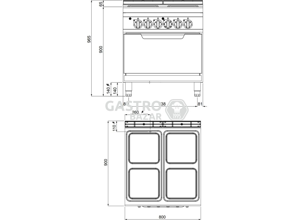 Elektrický sporák 4x plotýnka čtvercová (14 kW) + elektrická statická trouba (7,5 kW)