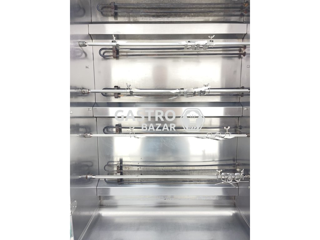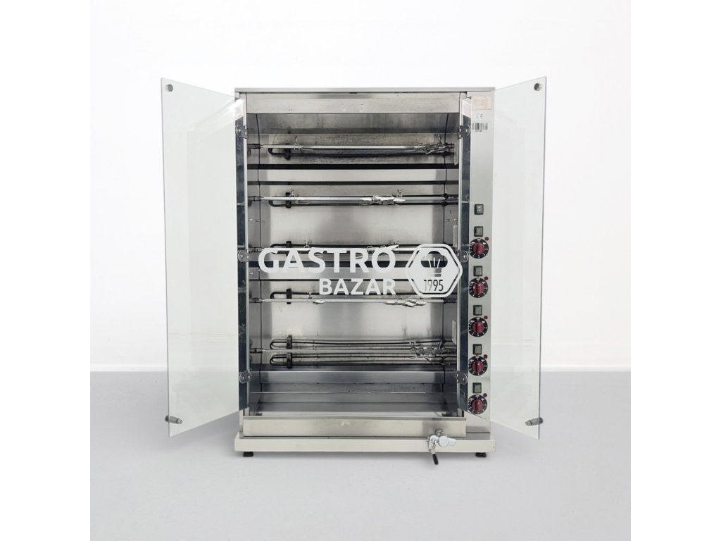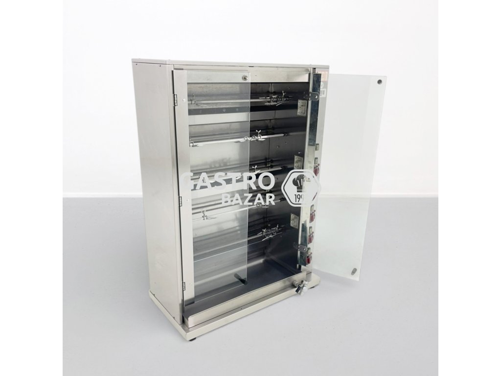 Profesionální gril na kuřata v celonerezovém provedení, vhodný pro gastronomické provozy, bistra nebo prodejny s grilovanými specialitami. Zařízení umožňuje samostatné ovládání jednotlivých jehel, což umožňuje flexibilní přípravu různých dávek masa.