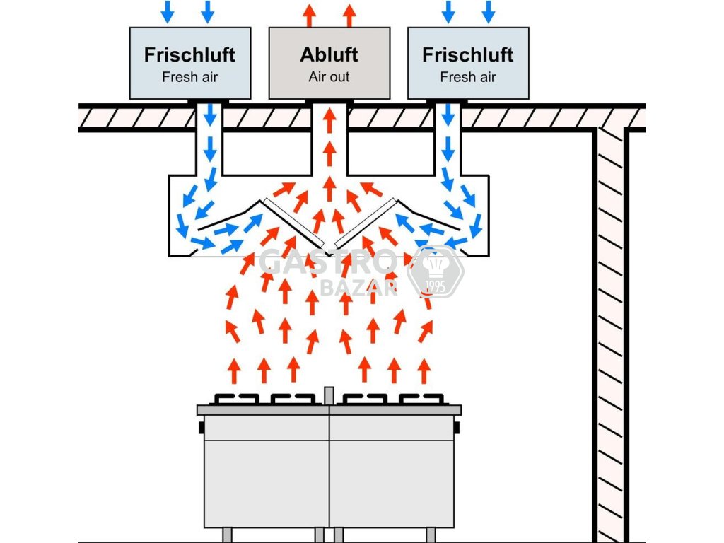 - Přívod venkovního vzduchu, který je speciální vnitřní konstrukcí vháněn přímo na tukové filtry, vytváří v kapotě podtlak. Podtlak způsobuje vysoký účinek odlučování a odsávání tuků.