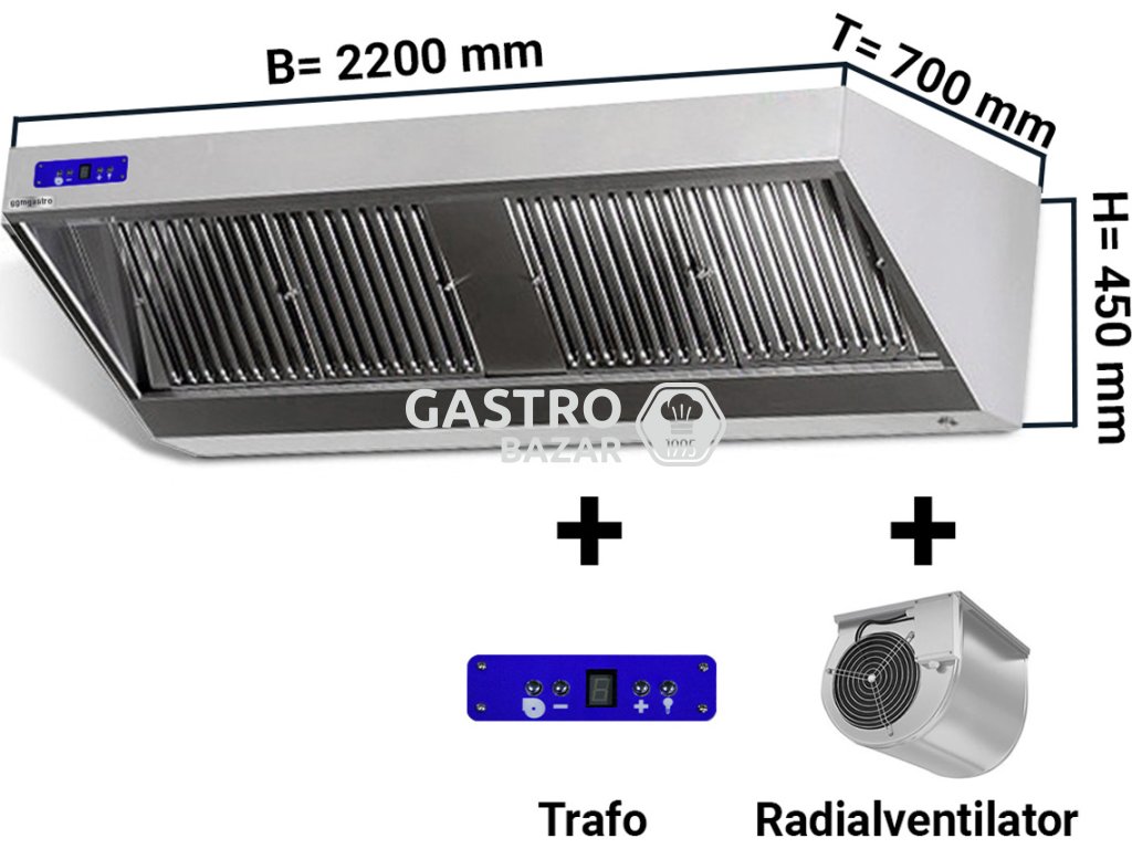 Nástěnná digestoř 2,2 m - s motorem, ovladačem, filtrem a světlem- hloubka 700 mm