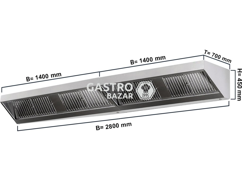 Nástěnná digestoř 2,8 m - s filtrem a světlem, hloubka 70 cm