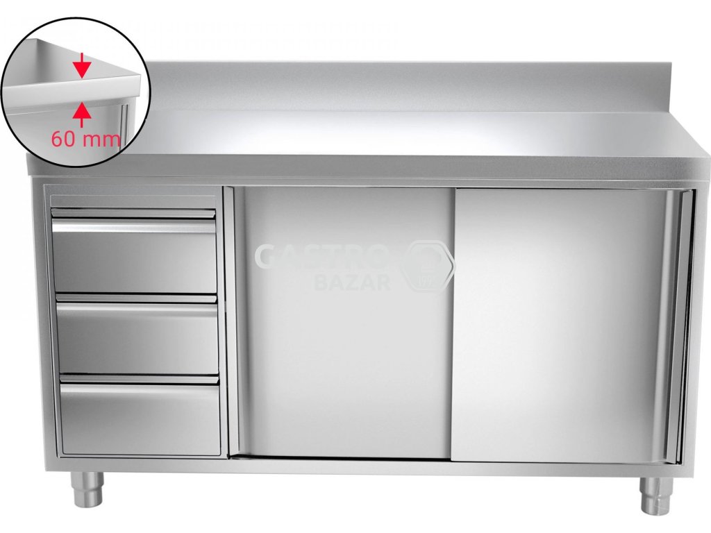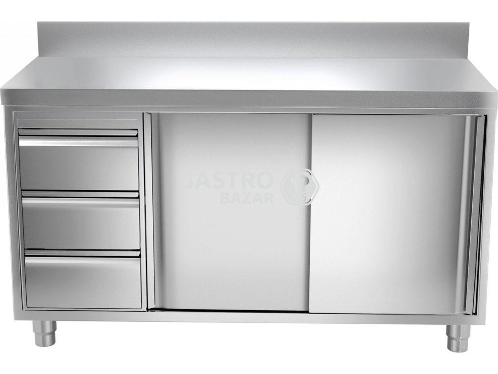 Nerezová pracovní skříň PREMIUM - 1,4 x 0,6m - se 3 zásuvkami vlevo a zadním lemem