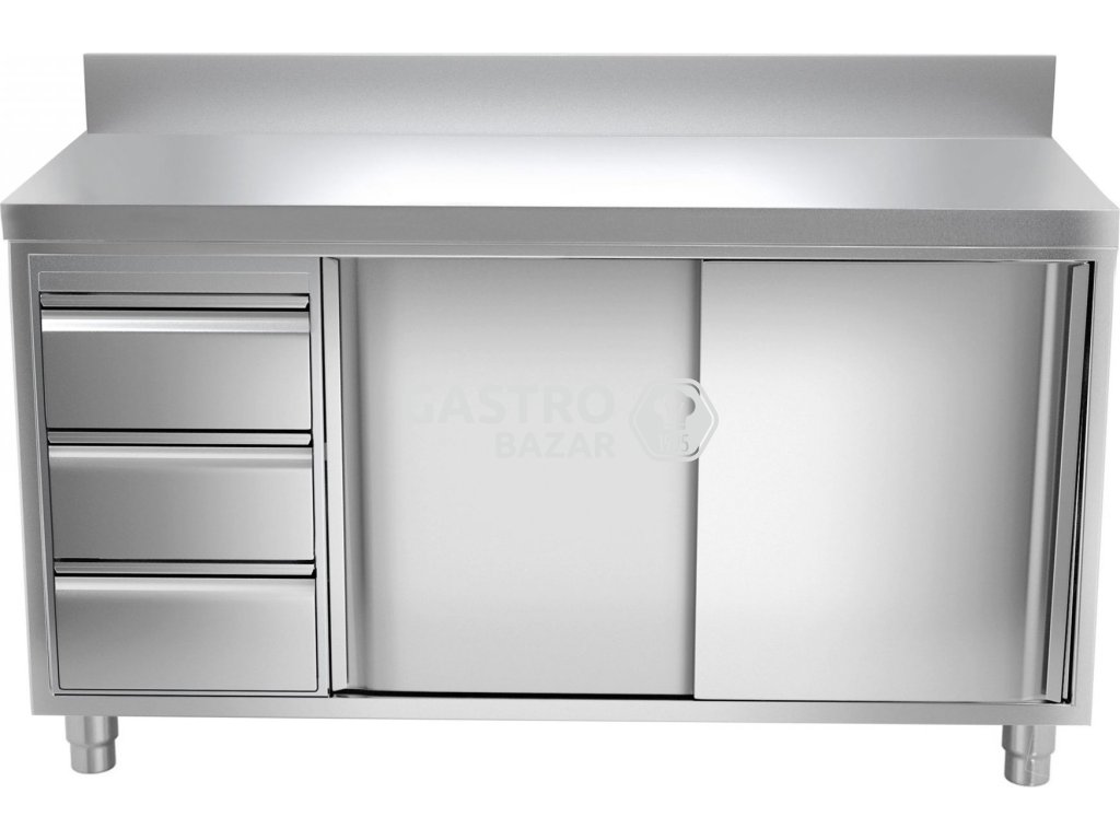 Nerezová pracovní skříň PREMIUM - 1,6 x 0,6m - se 3 zásuvkami vlevo a zadním lemem