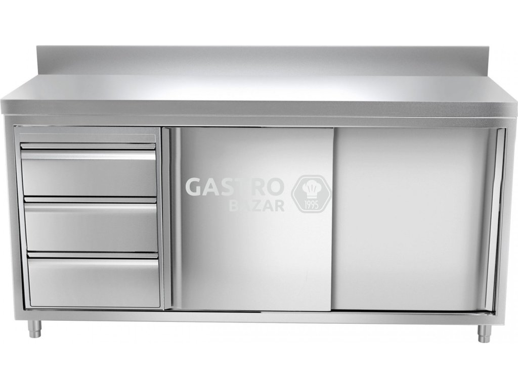 Nerezová pracovní skříň PREMIUM - 1,8 x 0,6 m - se 3 zásuvkami vlevo a zadním lemem