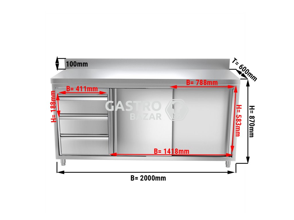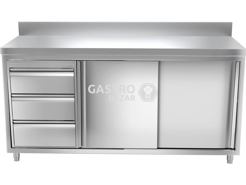 Nerezová pracovní skříň PREMIUM - 2,0 x 0,6 m - se 3 zásuvkami vlevo a zadním lemem