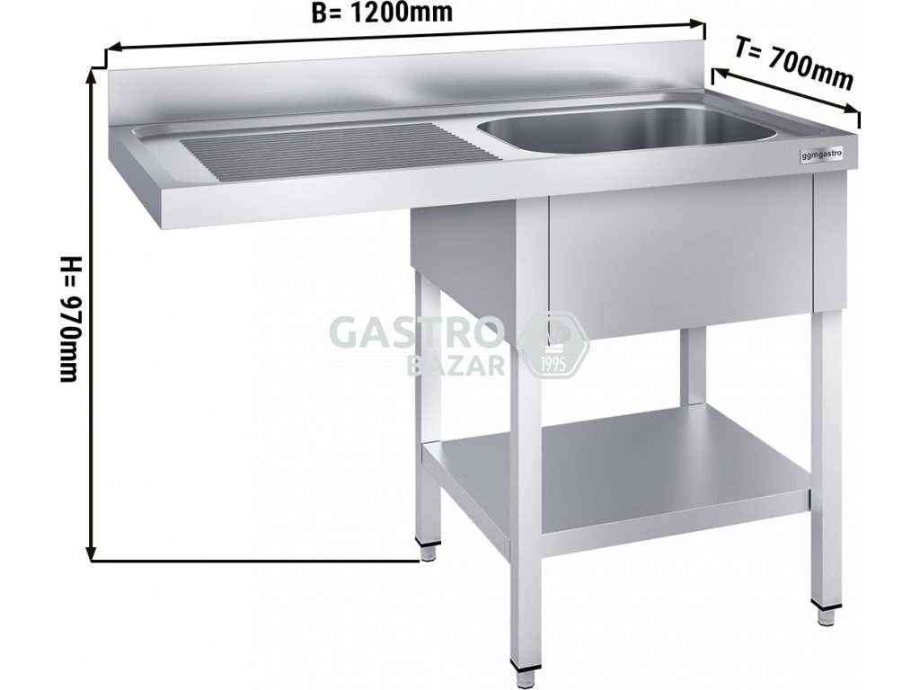 Nerezový dřez k myčce nádobí 1,2 m, 1 umyvadlo vpravo, hloubka 70 cm
