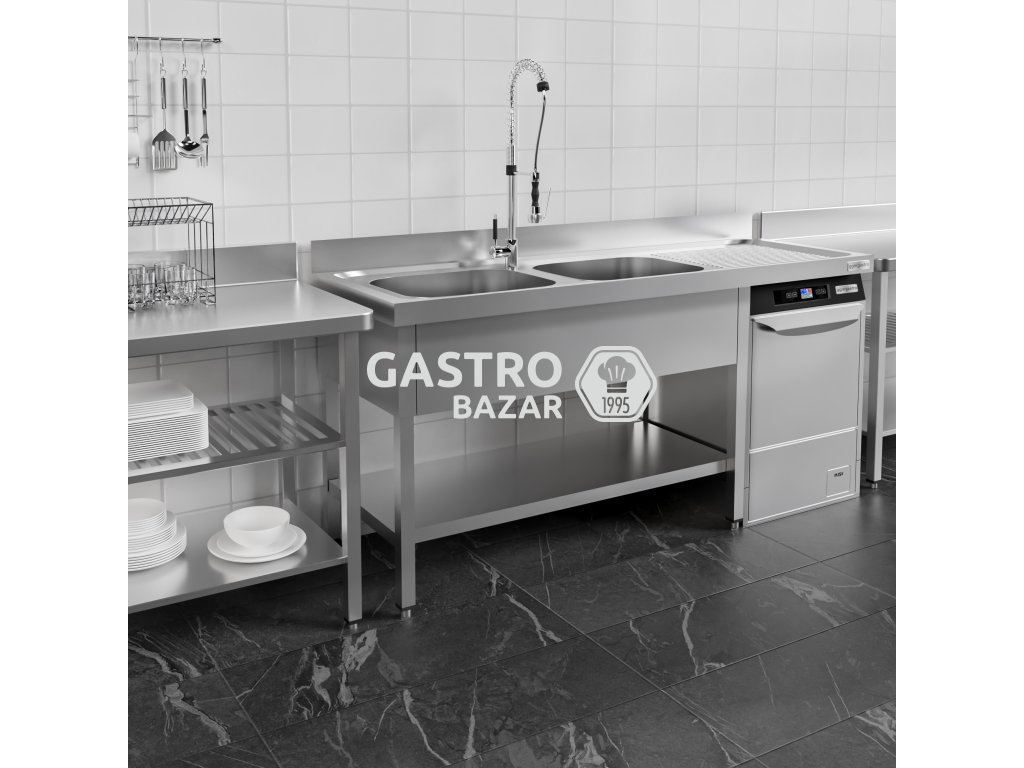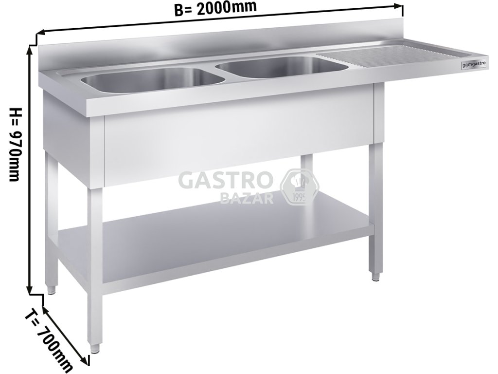 Nerezový dřez k myčce nádobí 2,0 m, 2 umyvadla vlevo, hloubka 70 cm