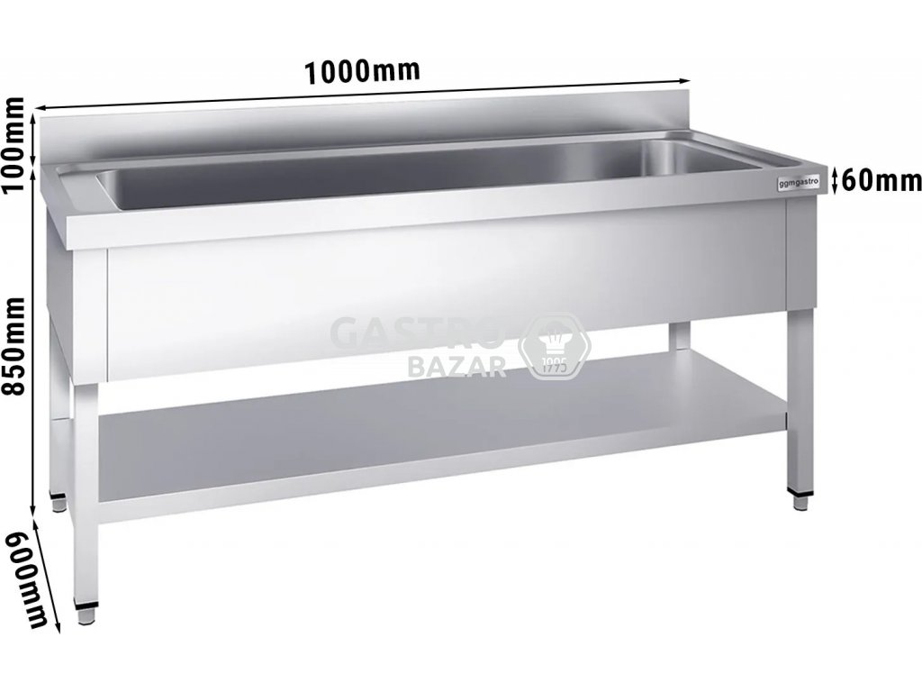 Nerezový dřez na černé nádobí se spodní policí 1,0 m, 1 umyvadlo, hloubka 60 cm