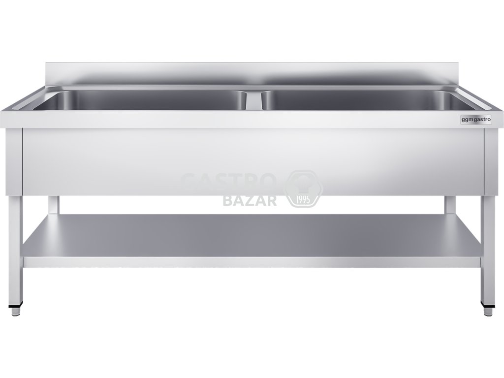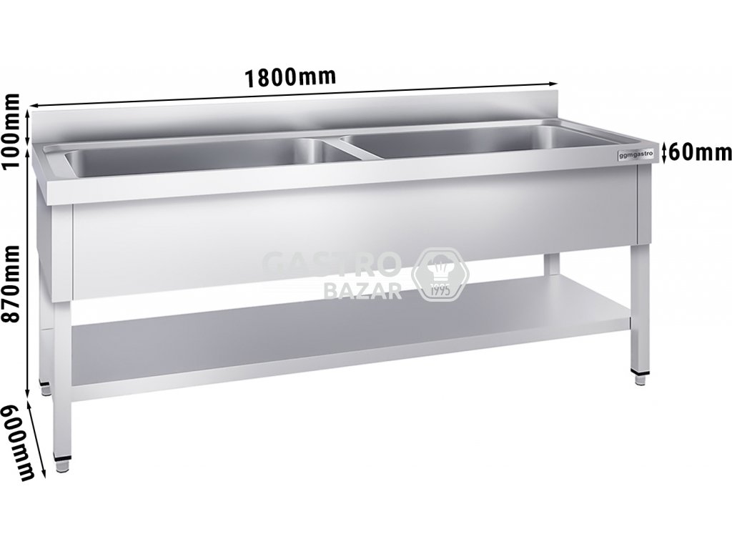 Nerezový dřez na černé nádobí se spodní policí 1,8 m, 2 umyvadla, hloubka 60 cm