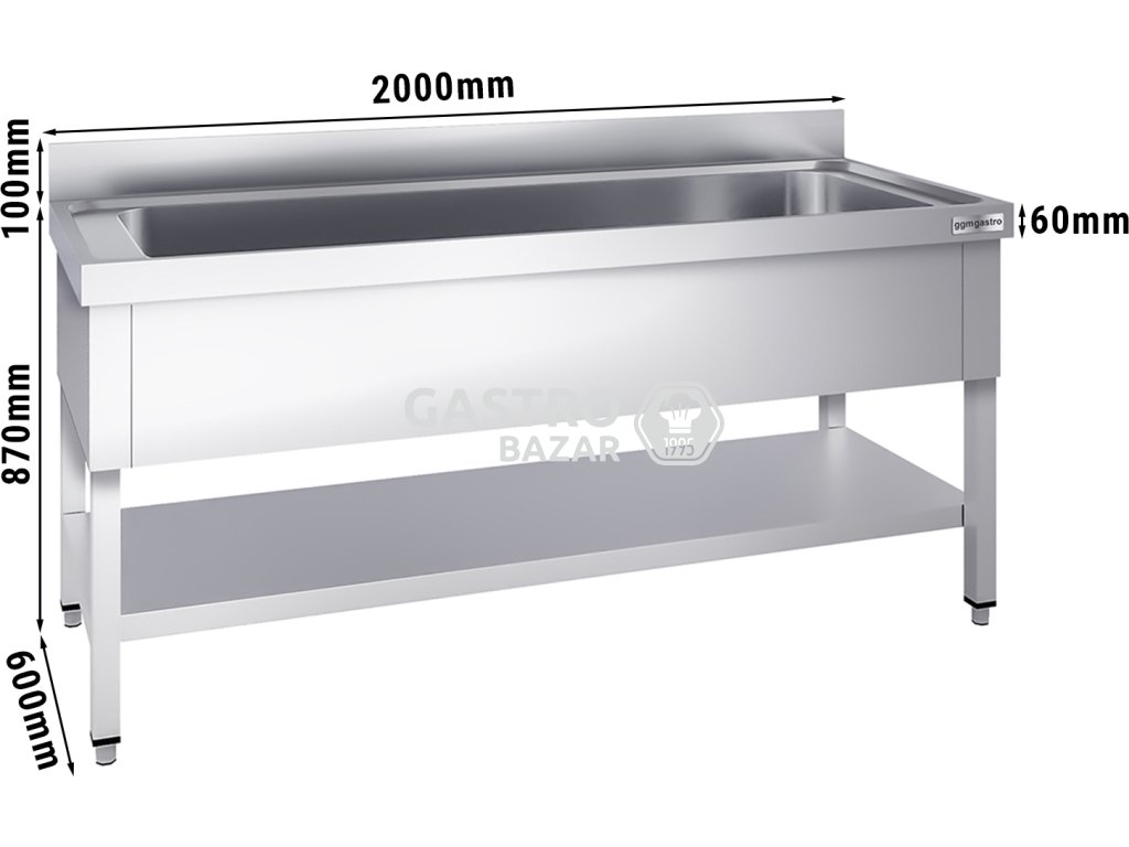 Nerezový dřez na černé nádobí se spodní policí 2,0 m, 1 umyvadlo, hloubka 60 cm
