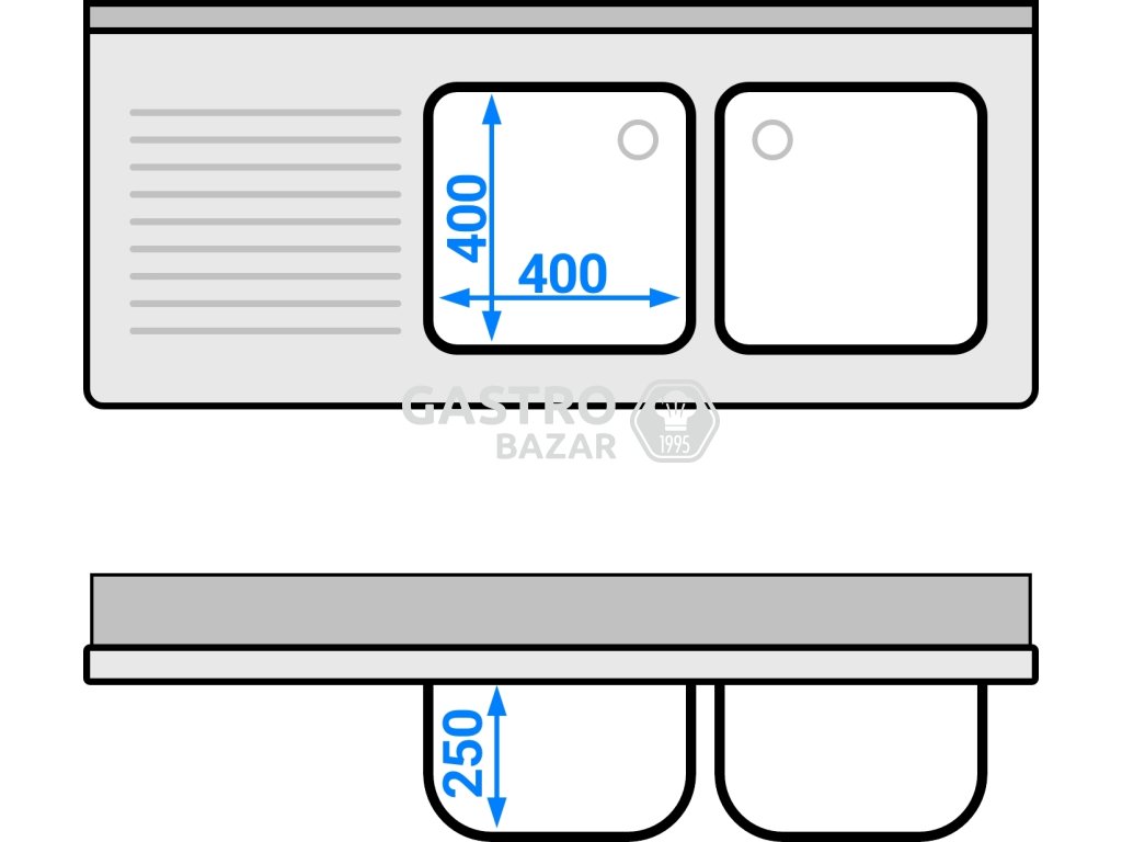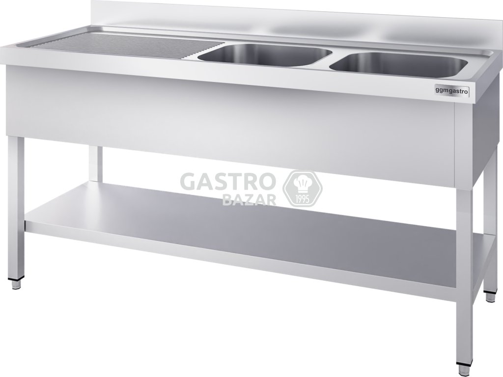 Mycí stůl PREMIUM z nerezové oceli - se spodní policí - 1,4 m - 2 dřezy vpravo - D 40 x Š 40 x H 25 cm