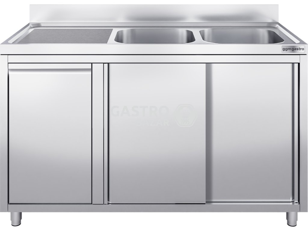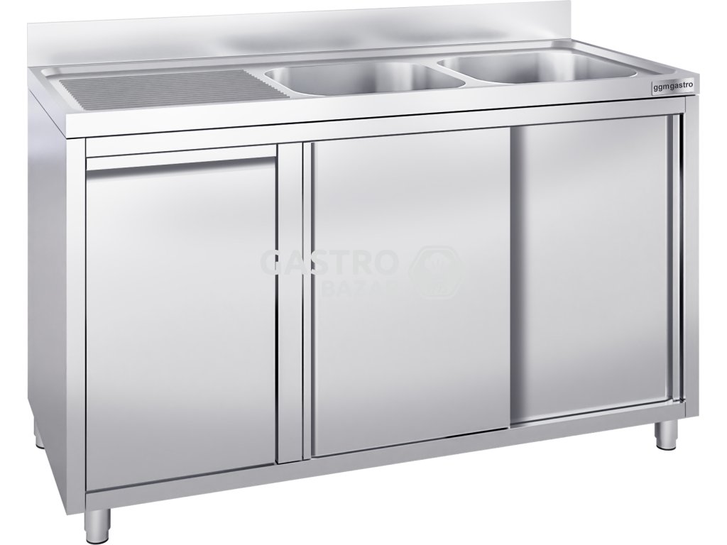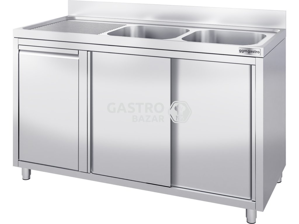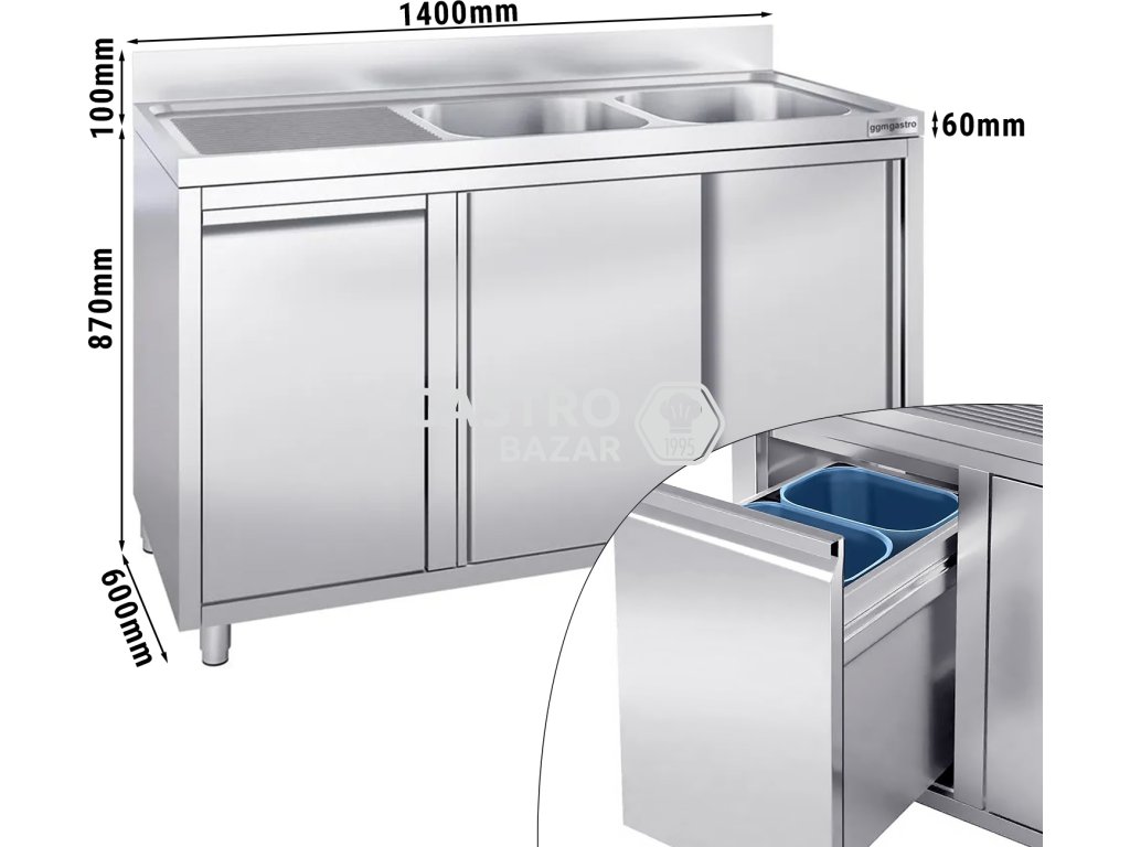 Nerezový dřez s odpadkovým košem 1,4 m, 2 dřezy vpravo s výsuvnými a posuvnými dveřmi, hloubka 60 cm