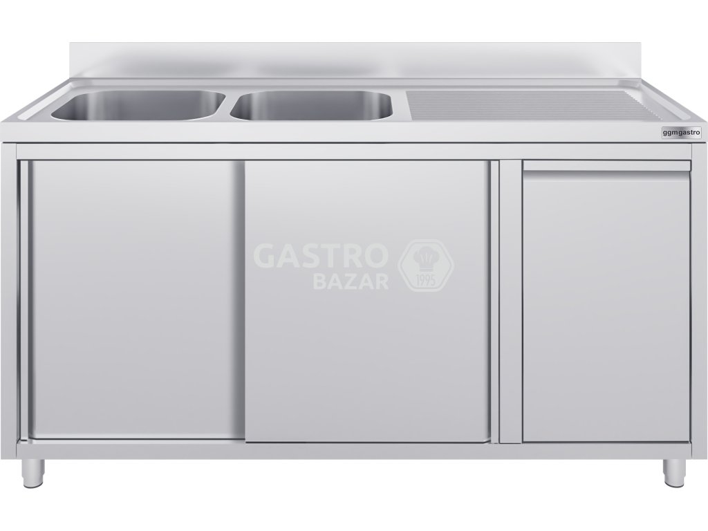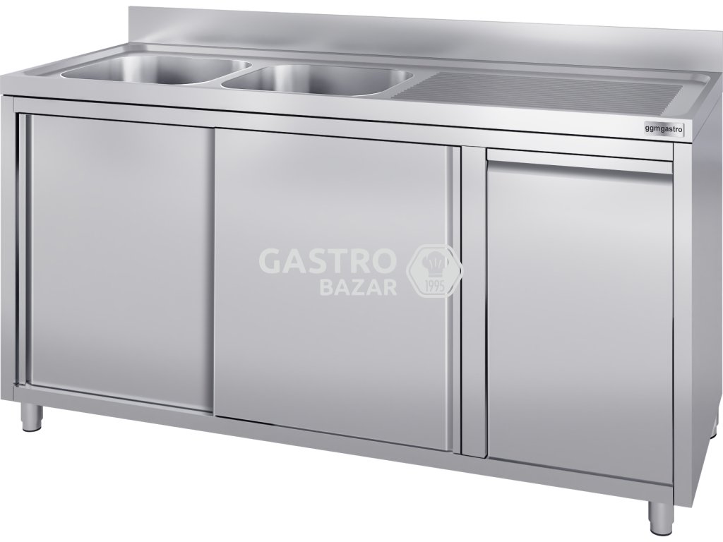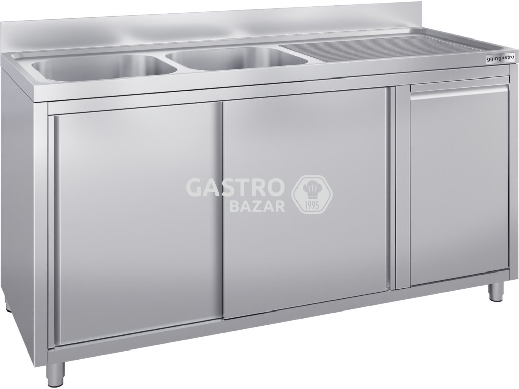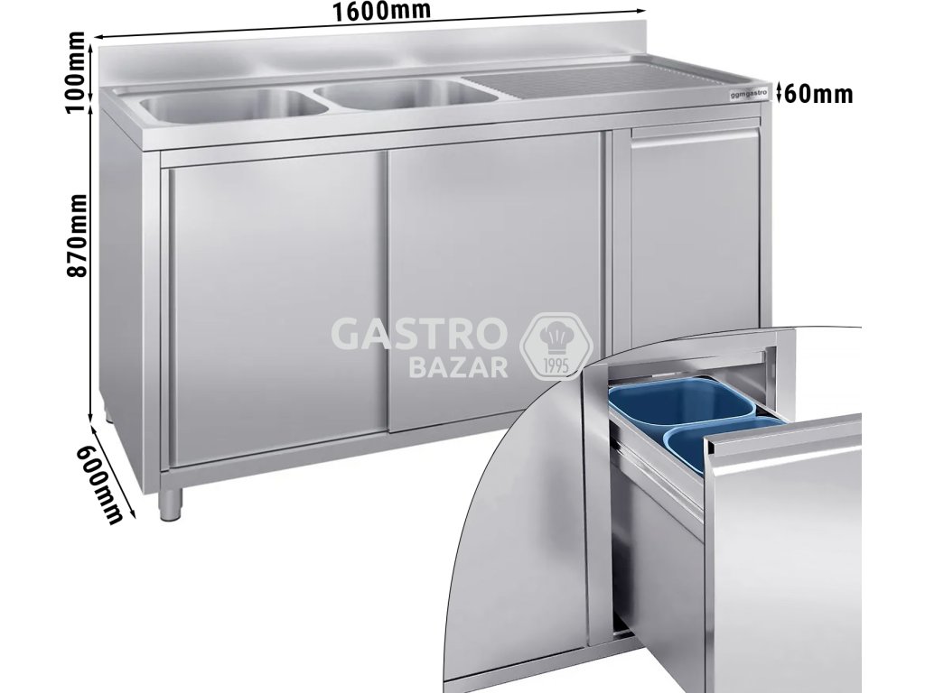 Nerezový dřez s odpadkovým košem 1,6 m, 2 dřezy vlevo s výsuvnými a posuvnými dveřmi, hloubka 60 cm