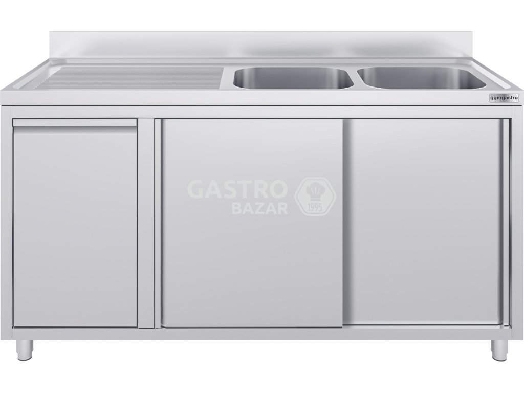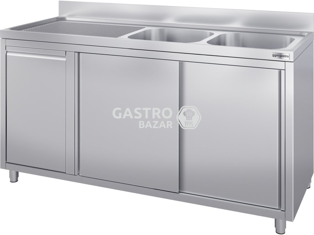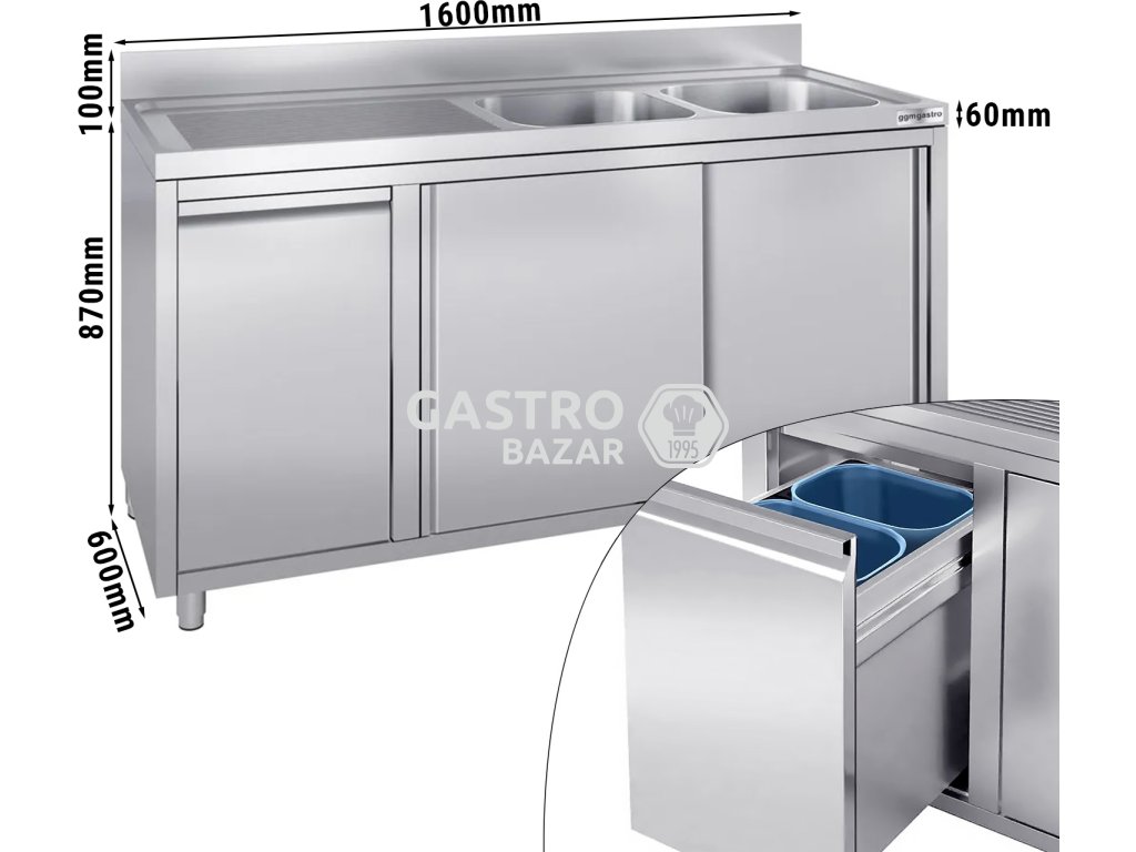 Nerezový dřez s odpadkovým košem 1,6 m, 2 dřezy vpravo s výsuvnými a posuvnými dveřmi, hloubka 60 cm