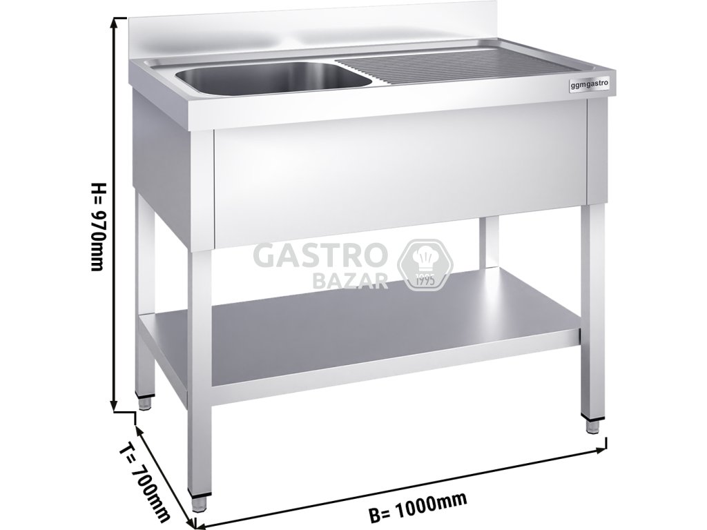 Dřezová skříňka PREMIUM z nerezové oceli - se spodní policí - 1,0 m - 1 dřez vlevo - D 50 x Š 50 x H 30 cm