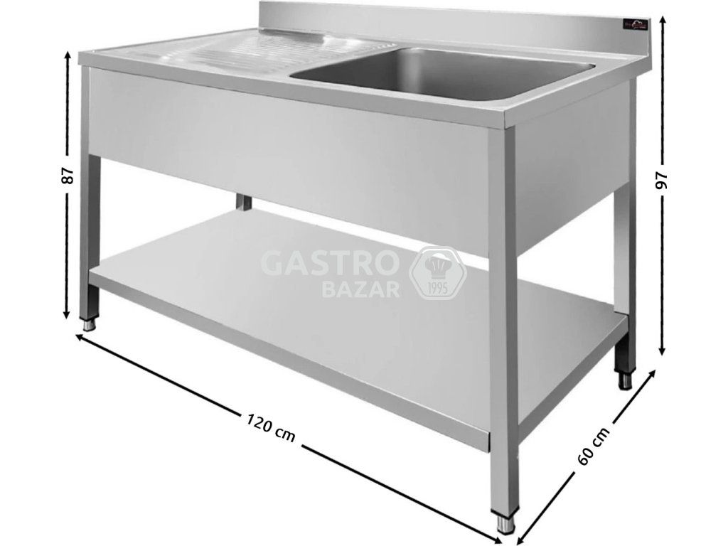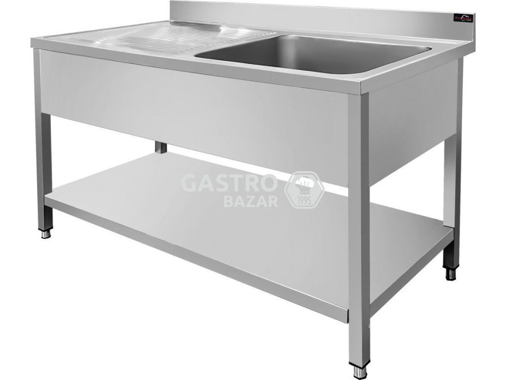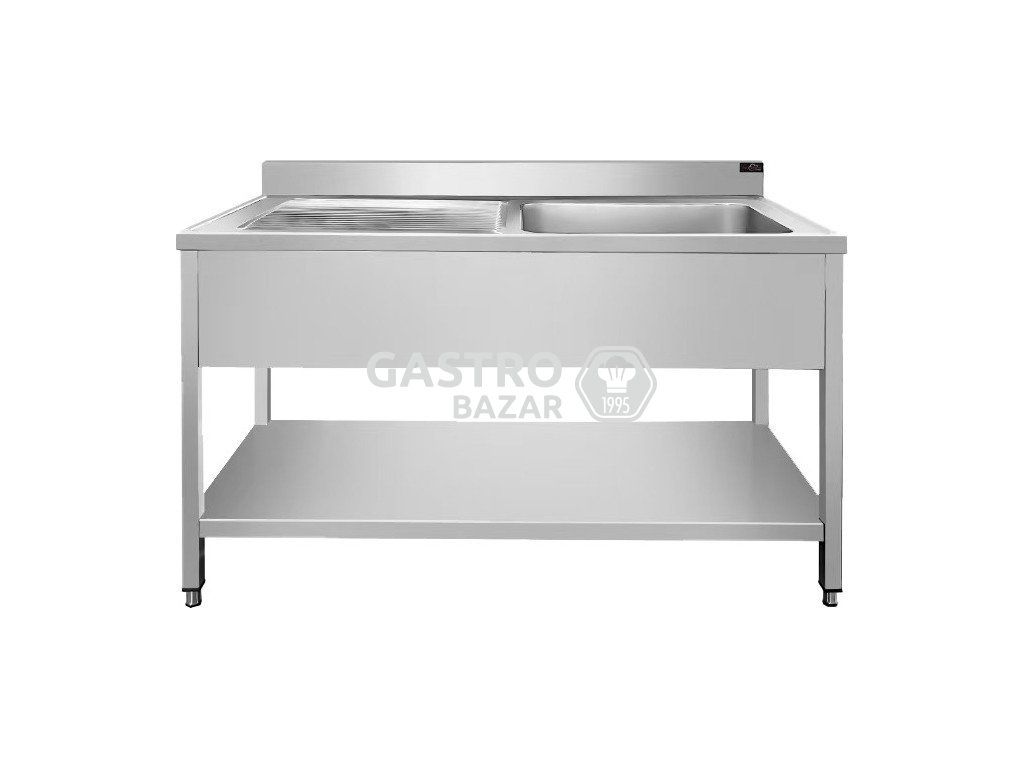 Nerezový mycí stůl PREMIUM s jedním dřezem vpravo, spodní policí a zadním lemem 1,2 m