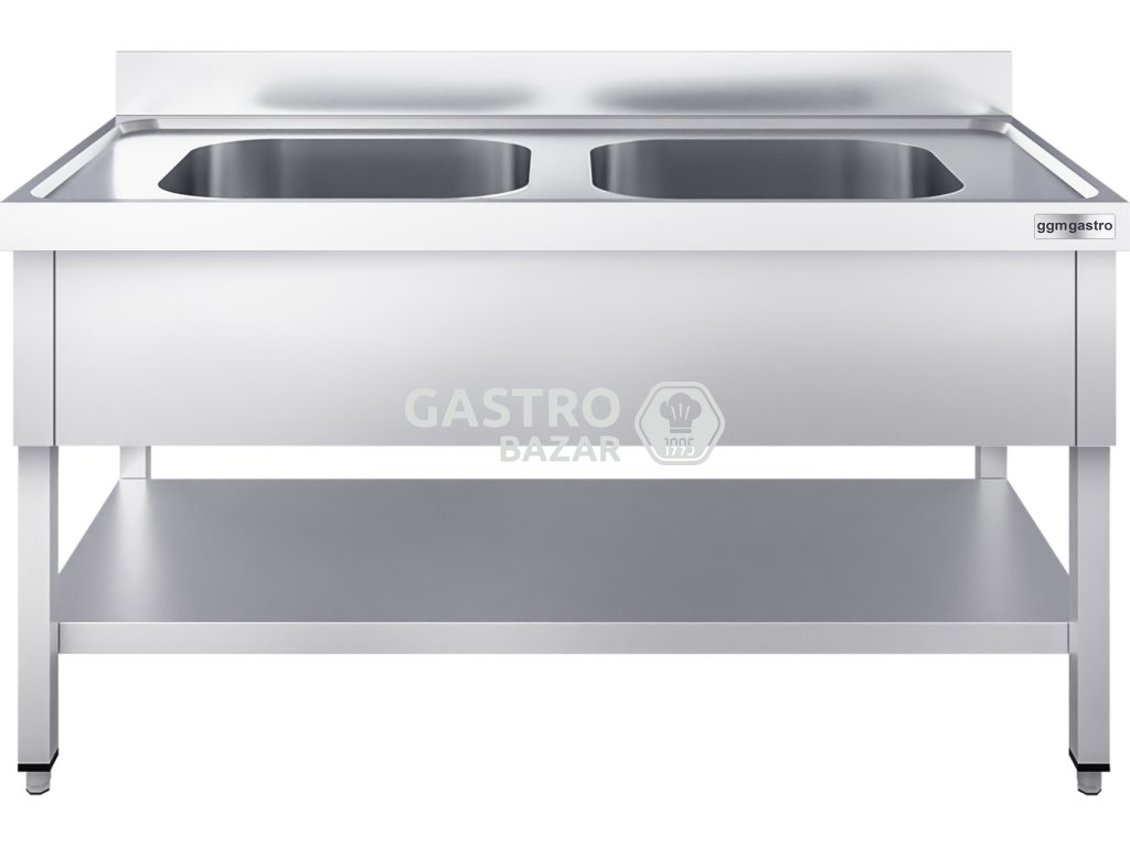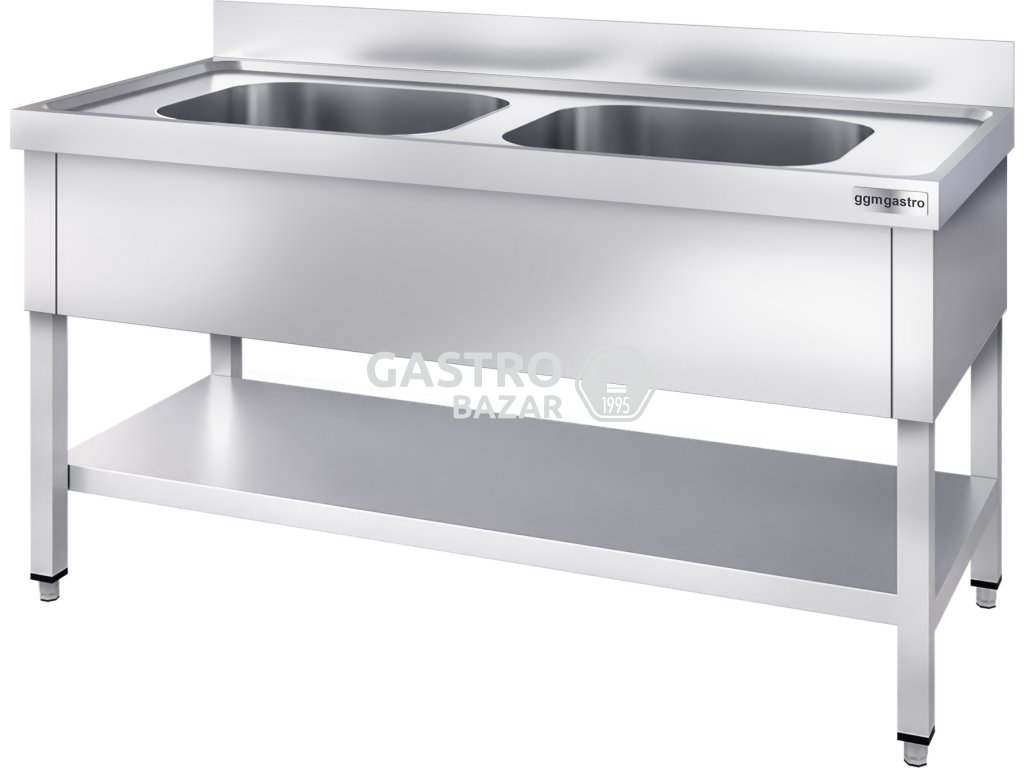 Nerezový dřez s policí 1,6 m, 2 dřezy uprostřed, hloubka 60 cm