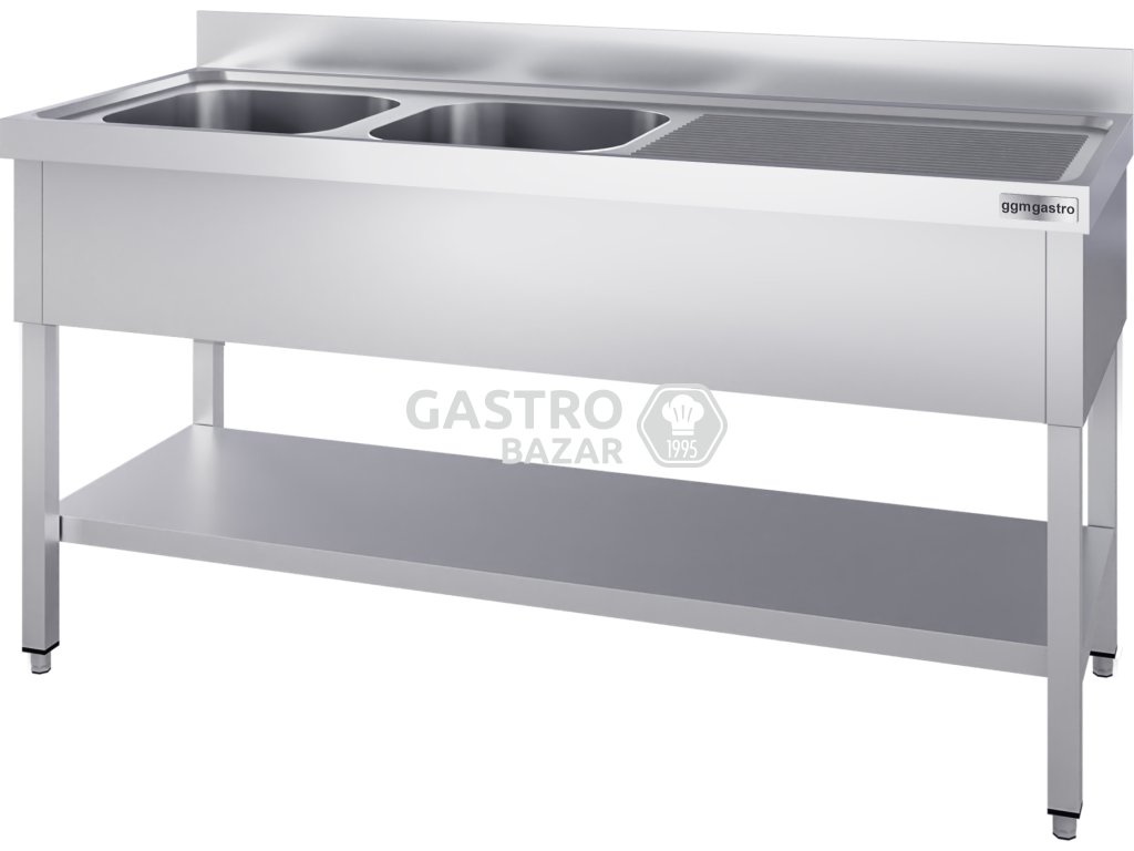 Nerezový dřez s policí 2,0 m, 2 umyvadla vlevom hloubka 70 cm