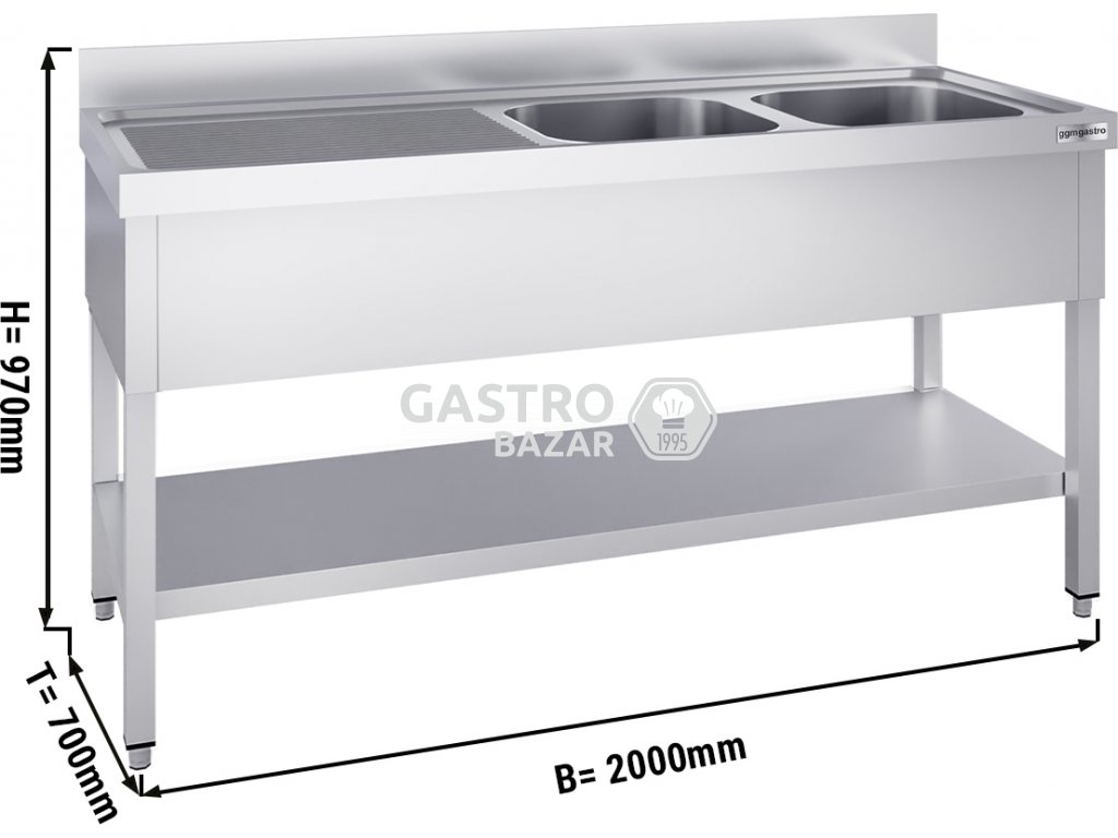 Nerezový dřez s policí 2,0 m, 2 umyvadla vpravo, hloubka 70 cm