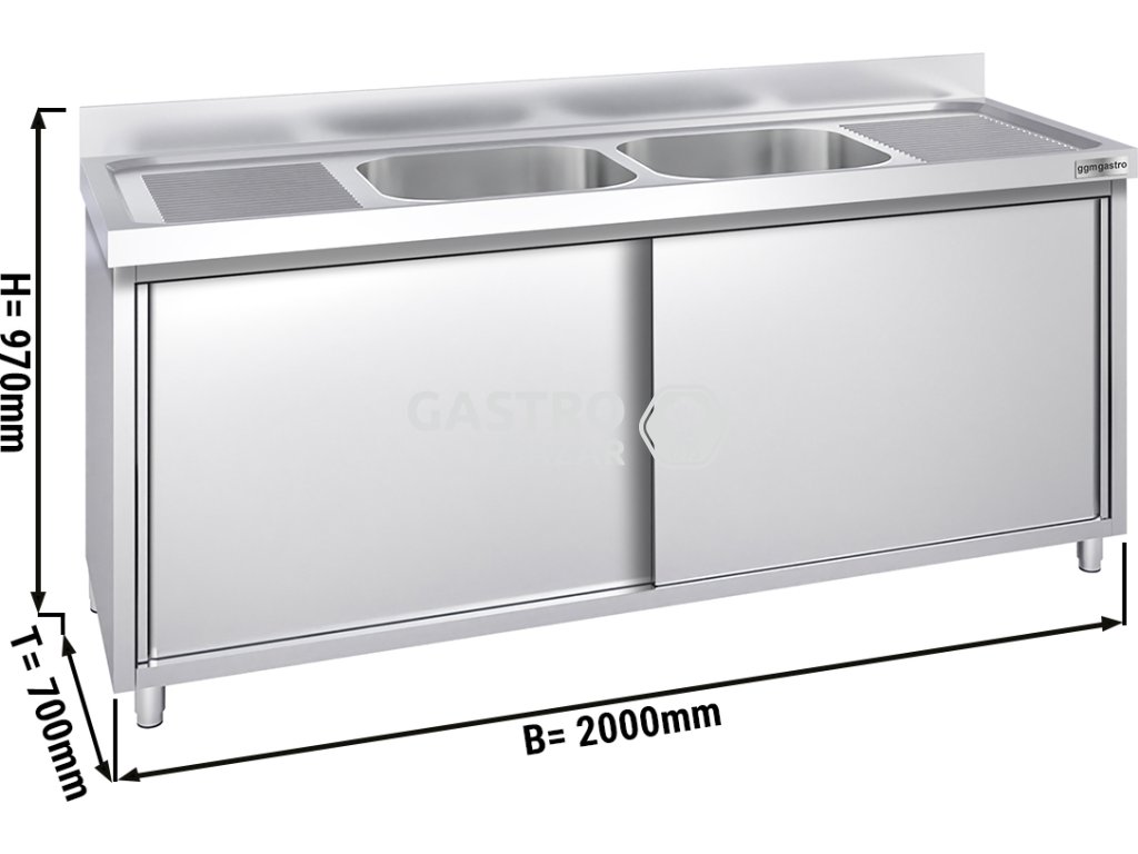 Nerezový dřez s posuvnými dveřmi 2,0 m, 2 dřezy uprostřed, hloubka 70 cm