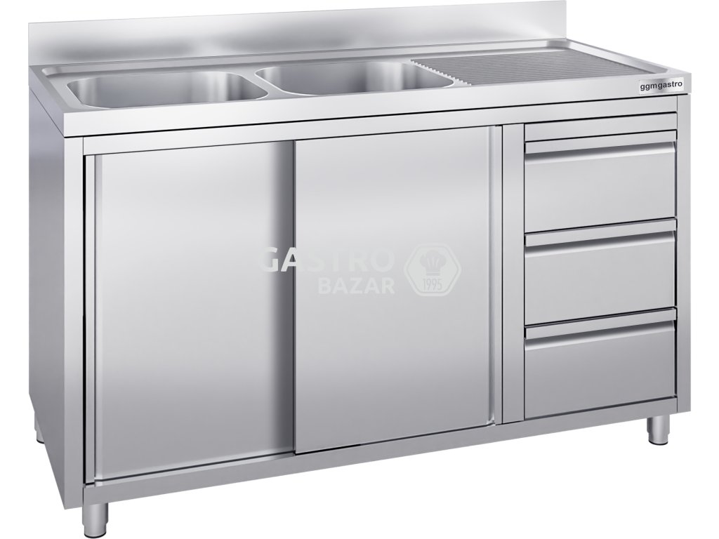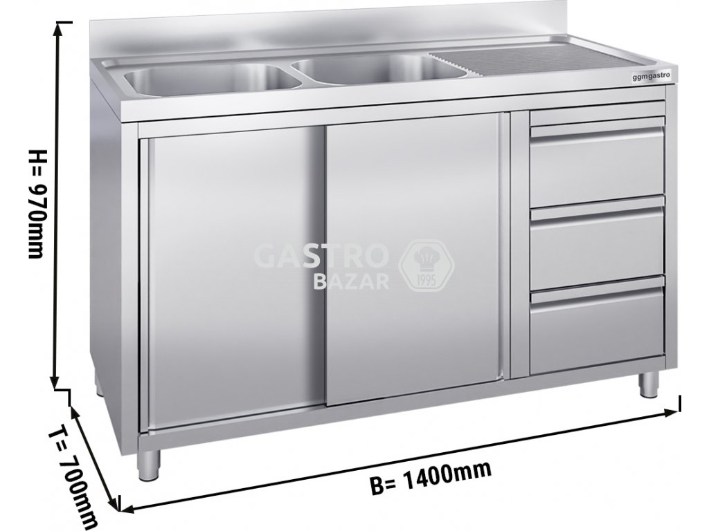 Nerezový dřez se třemi zásuvkami 1,4 m, 2 dřezy vlevo s posuvnými dveřmi, hloubka 70 cm