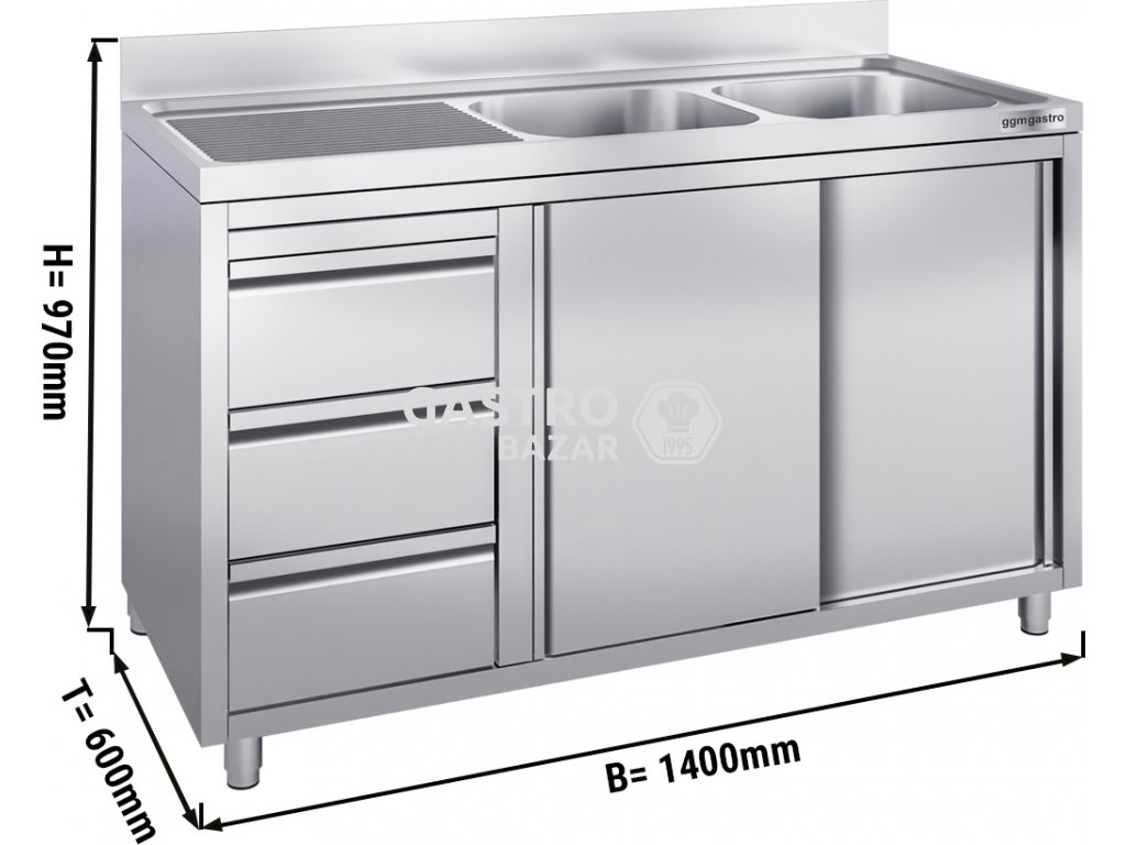 Nerezový dřez se třemi zásuvkami 1,4 m, 2 dřezy vpravo s posuvnými dveřmi, hloubka 60 cm