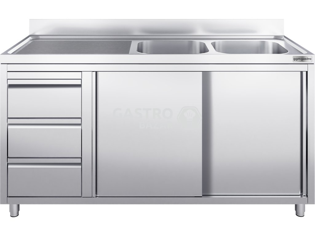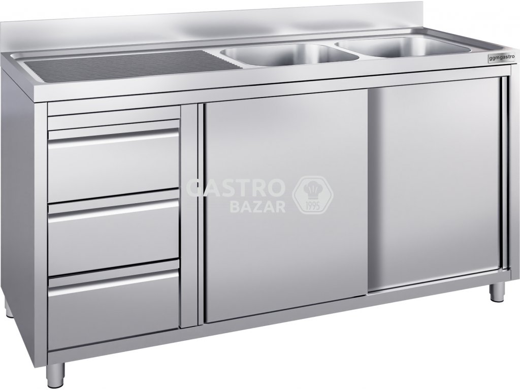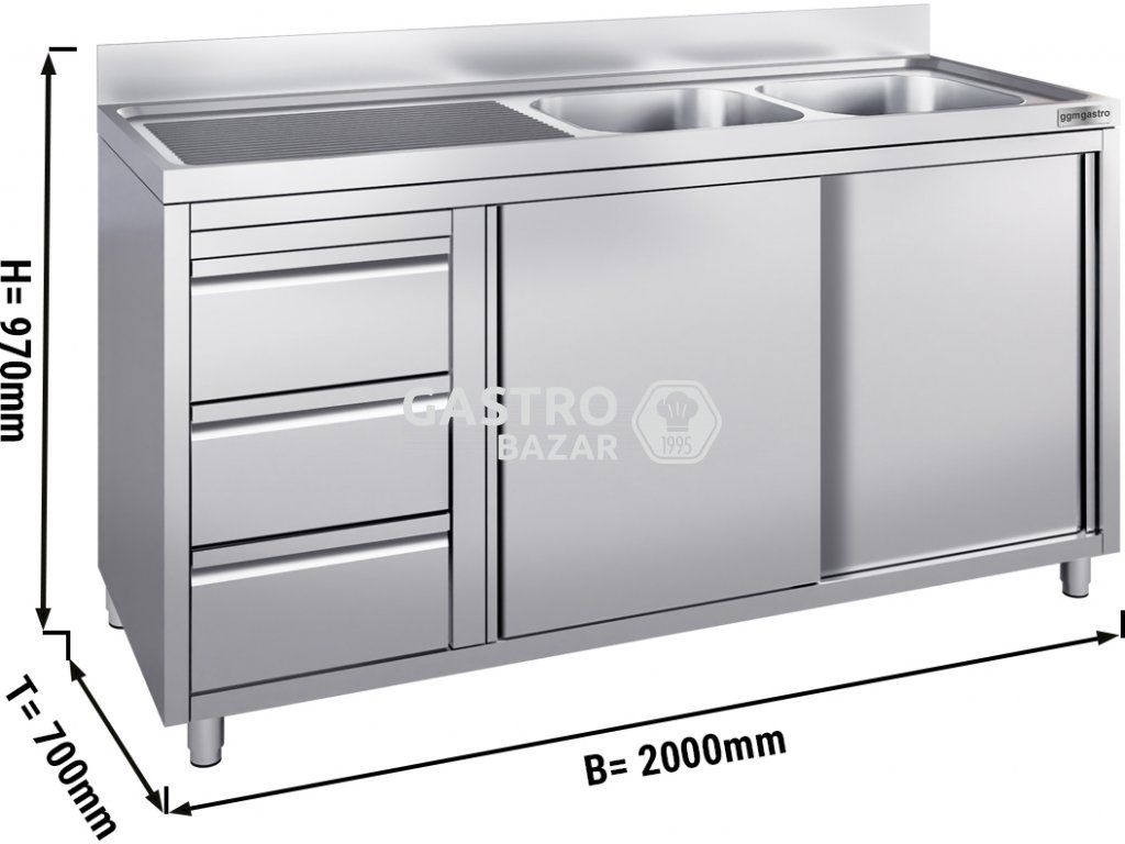 Nerezový dřez se třemi zásuvkami 2,0 m, 2 dřezy vpravo s posuvnými dveřmi, hloubka 70 cm