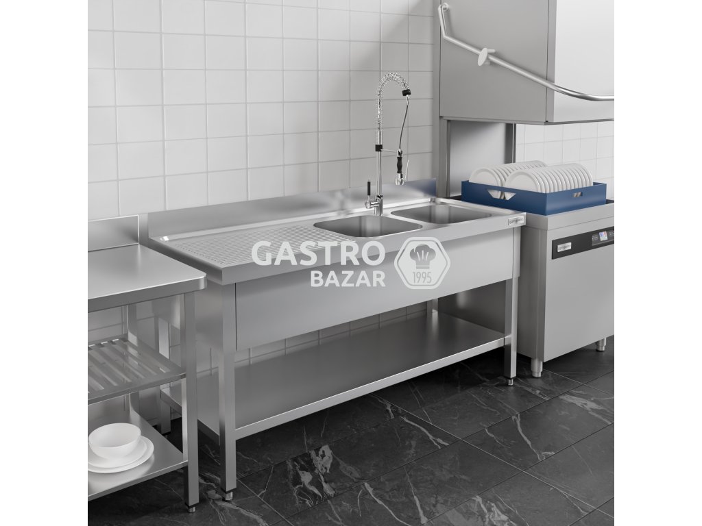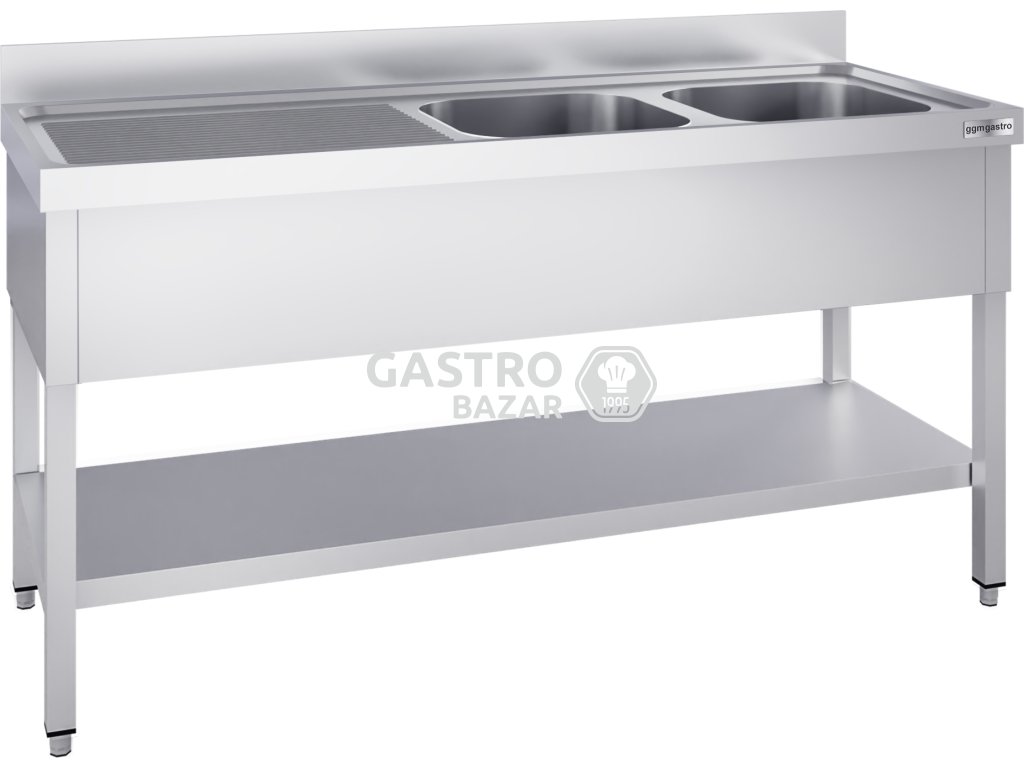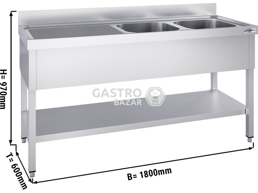 Nerezový dřez se základnou 1,8 m, 2 umyvadla vpravo, hloubka 60 cm