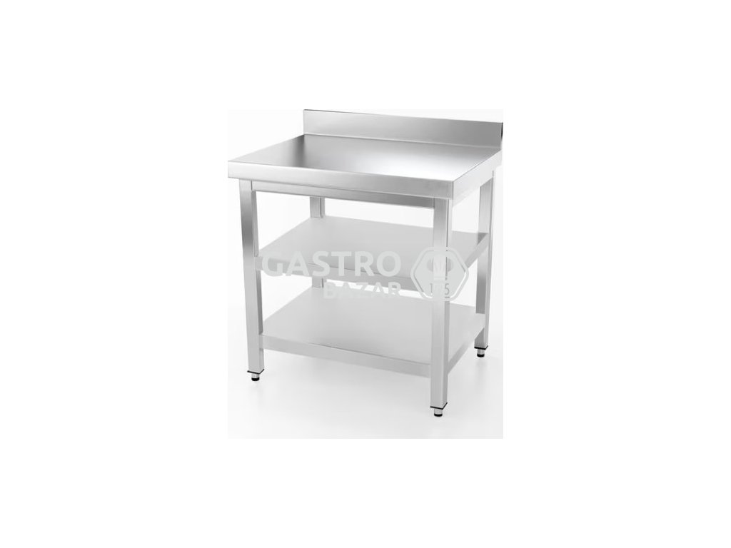 Nerezový pracovní stůl PREMIUM se dvěma policemi a zadním lemem 0,6 m