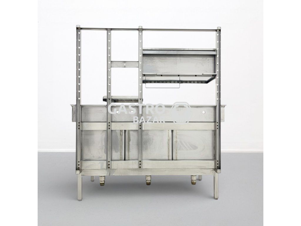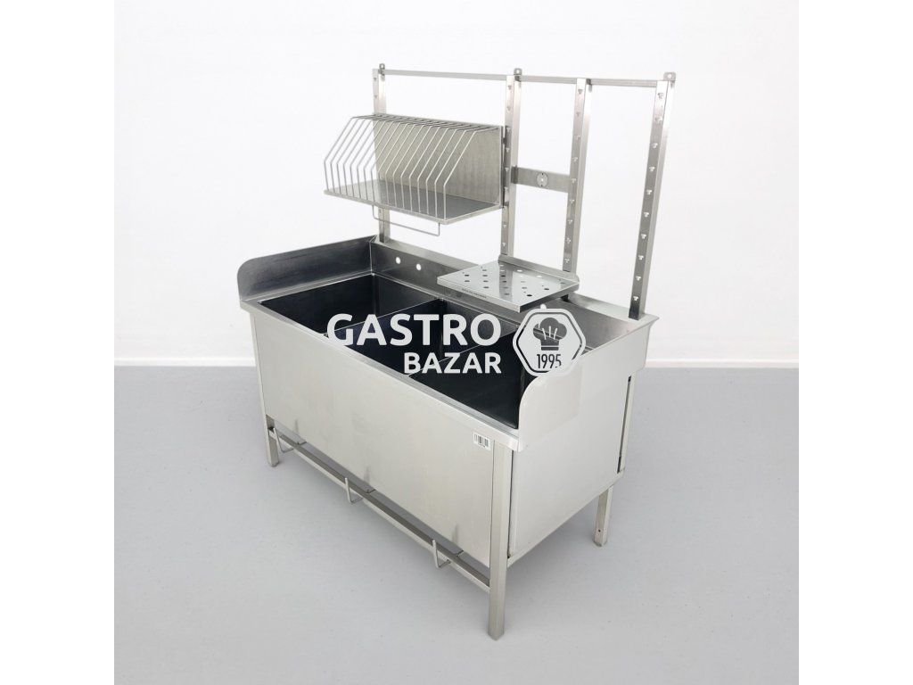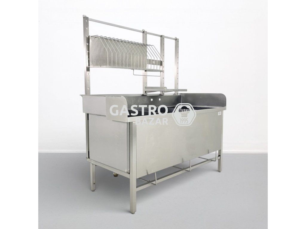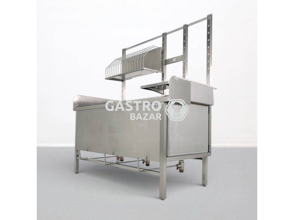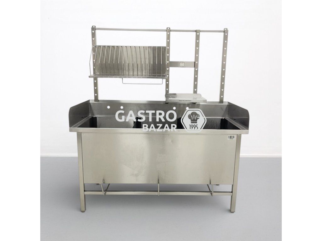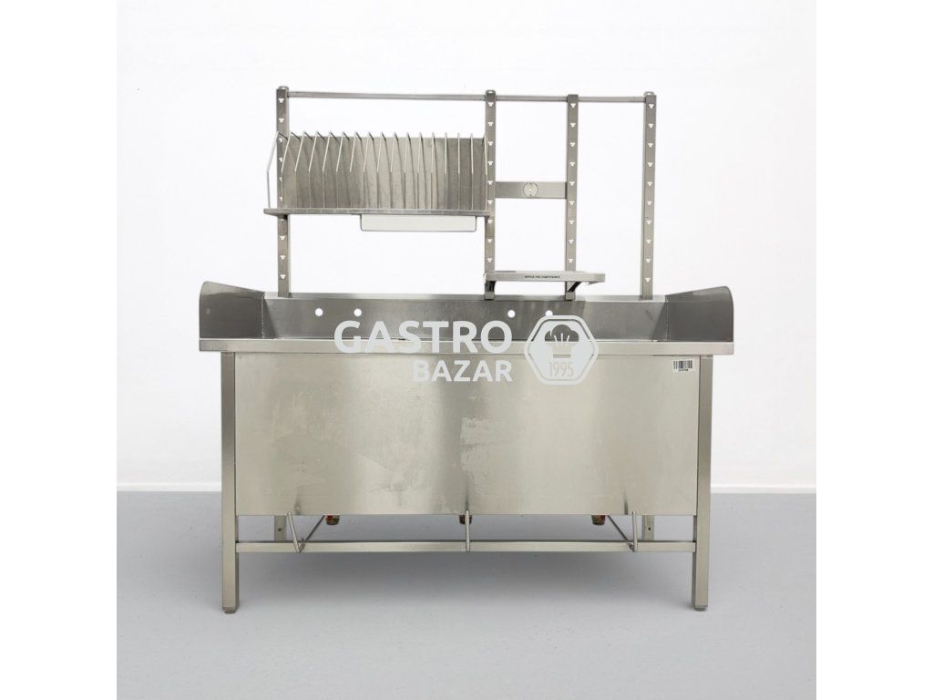 Masivní nerezový trojdřez určený pro profesionální gastronomické provozy. Robustní provedení s vysokým zadním lemem pomáhá chránit okolí proti rozstřiku vody. Součástí je také horní nástavec s odkládací perforovanou poličkou.