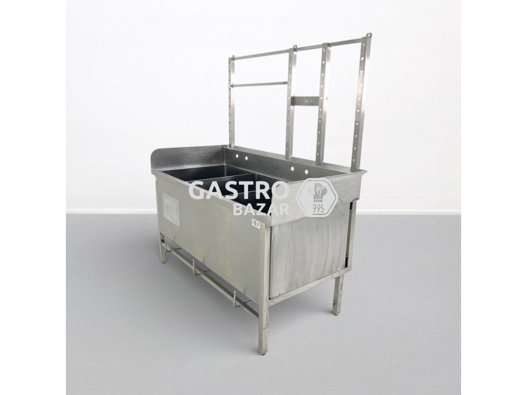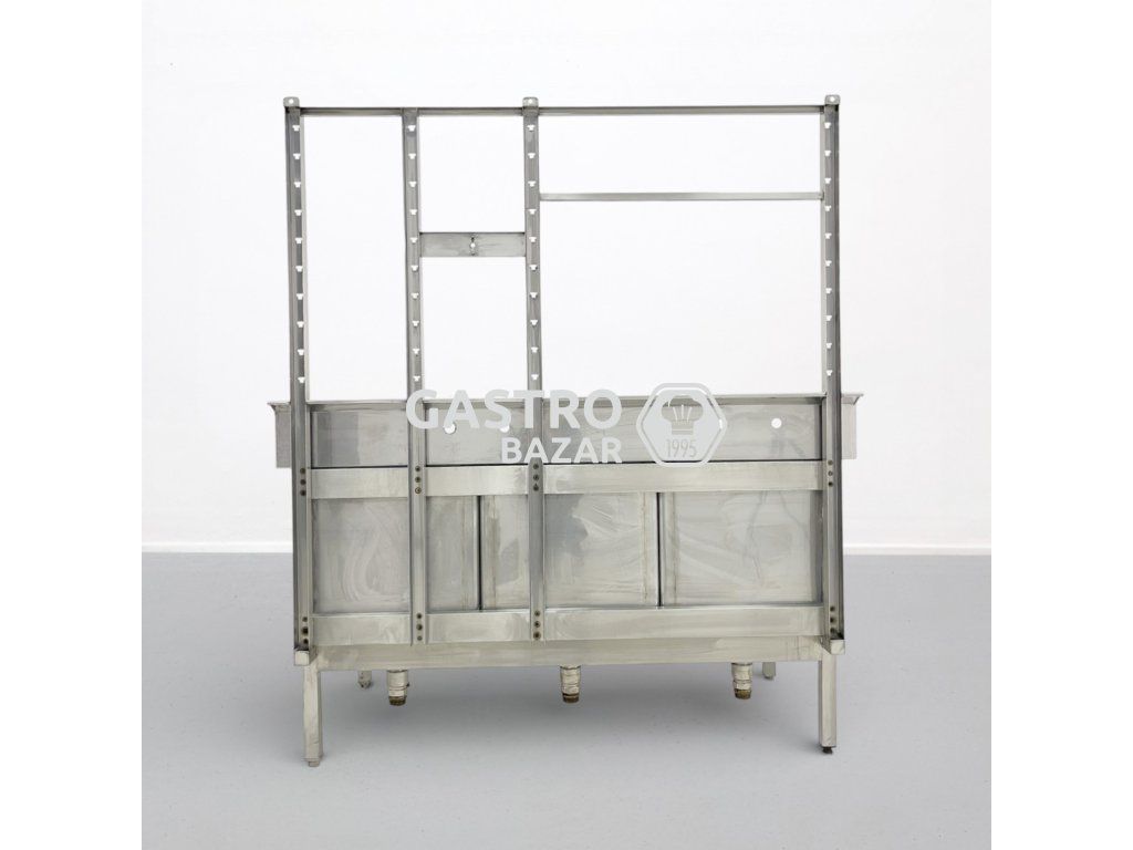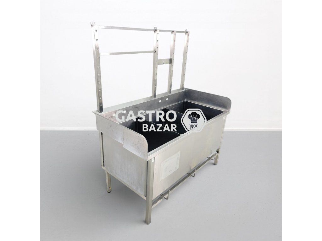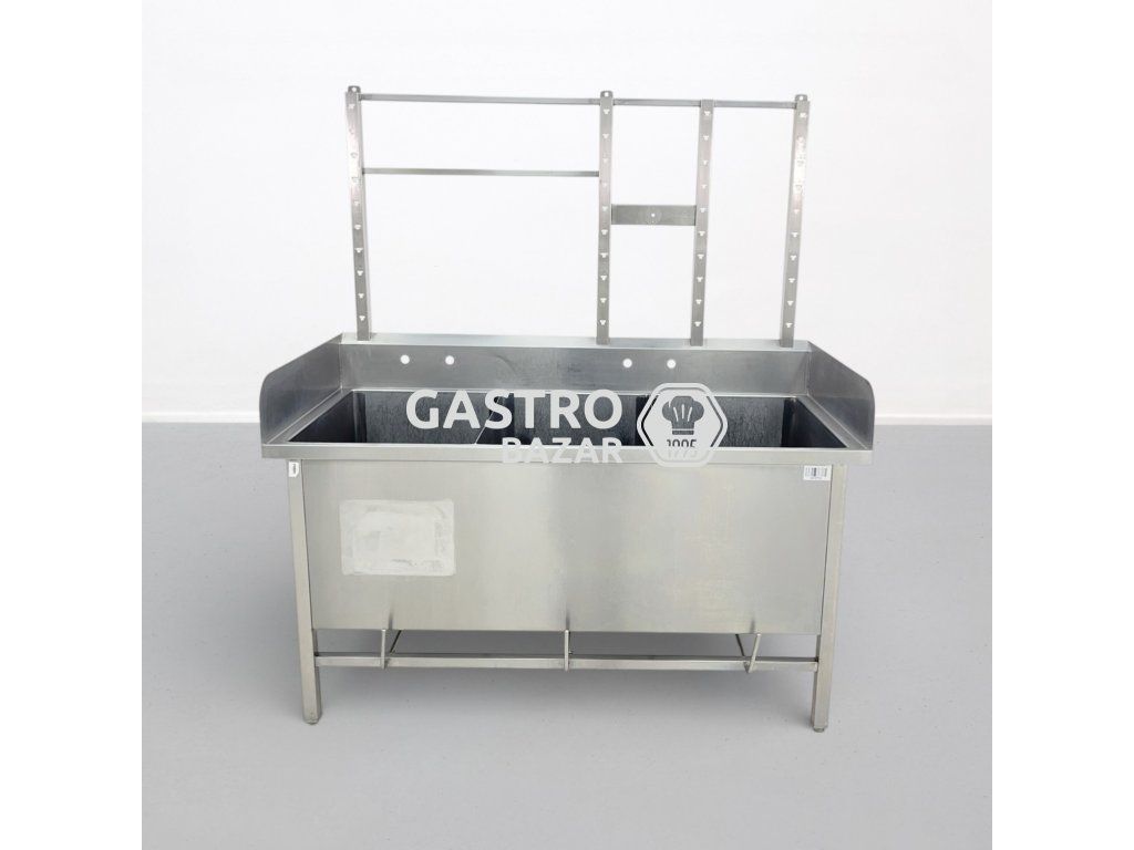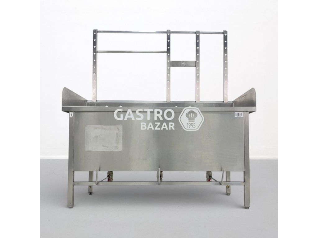 Masivní nerezový trojdřez určený pro profesionální gastronomické provozy. Robustní provedení s vysokým zadním lemem pomáhá chránit okolí proti rozstřiku vody. Součástí je také horní nástavec s odkládací perforovanou poličkou.