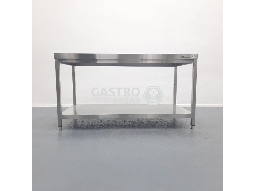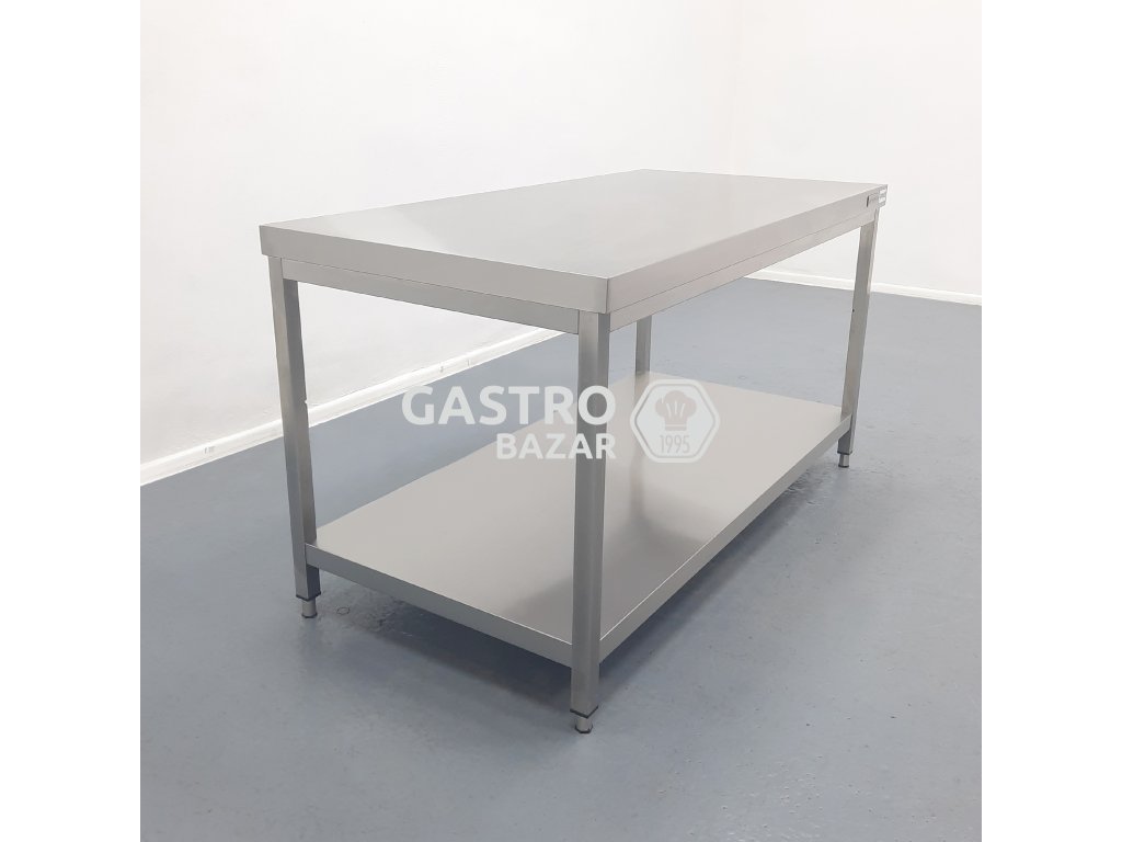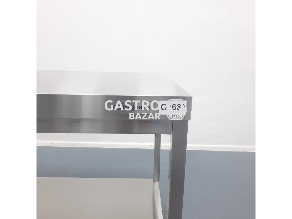 Nový, nikdy nepoužitý nerezový stůl s policí dole, bez lemu.