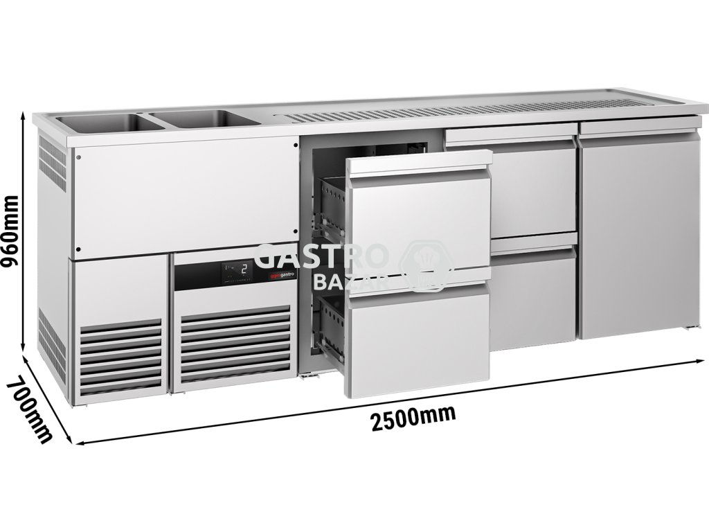 Pivní pult - 2,5 x 0,7 m - 1 dveře se 4 1/2 zásuvkami