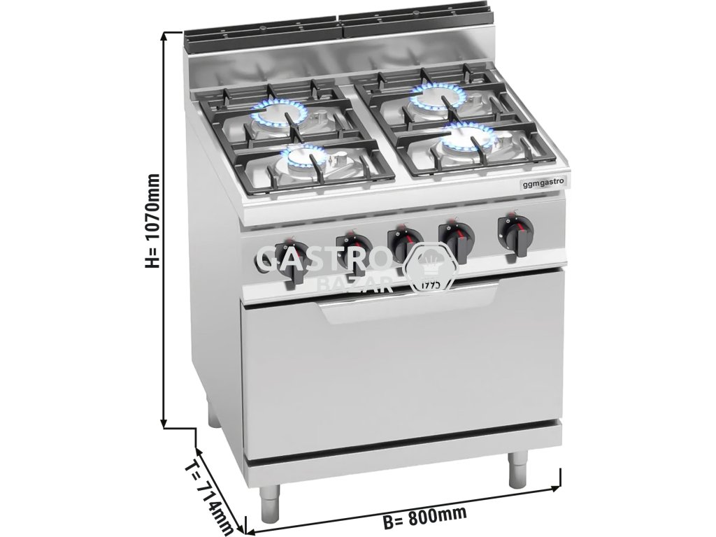 Plynový sporák 4 hořáky (21,5 kW) + elektrická trouba statická (7,5 kW)