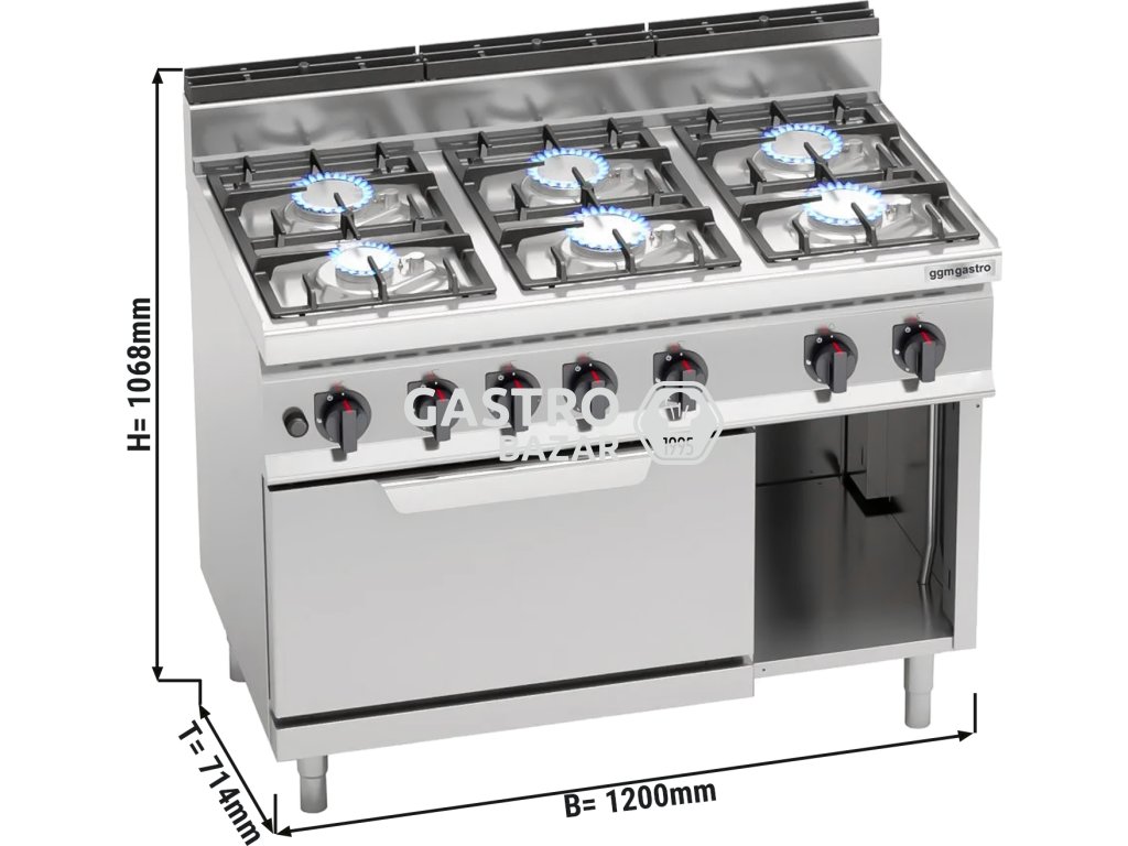 Plynový sporák 6x hořák (33,5 kW) + plynová trouba (7,8 kW)