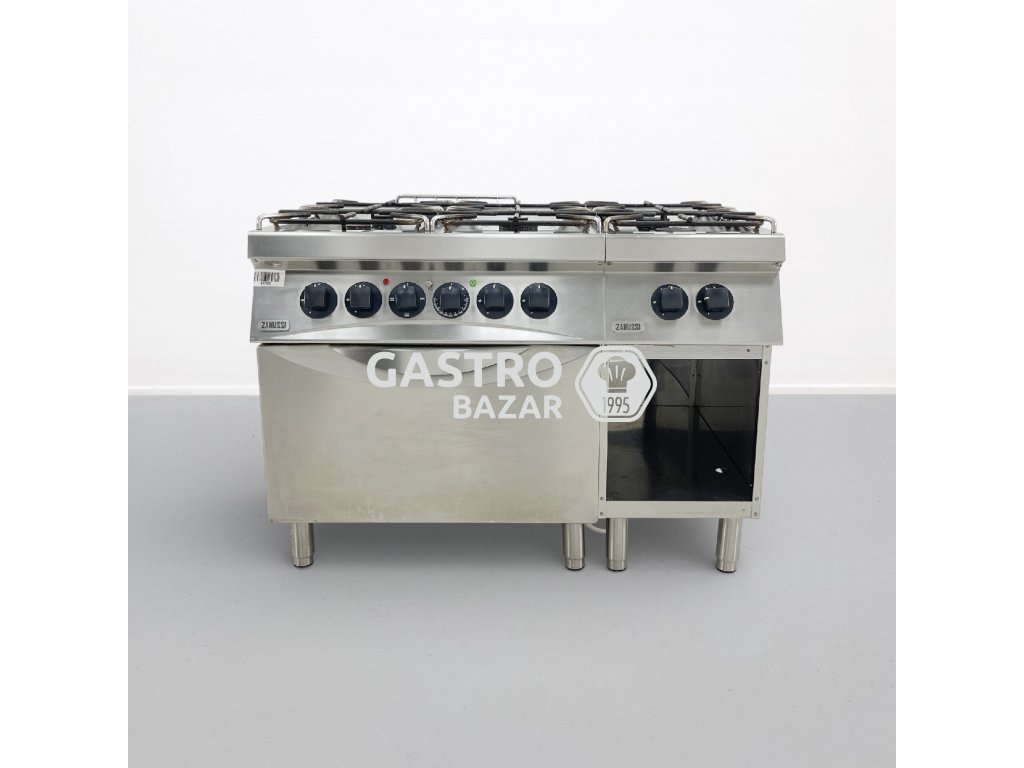 Nabízíme použitý profesionální plynový sporák se šesti hořáky, elektrickou troubou a spodní skříňkou, vhodný pro restaurace, jídelny a další gastronomické provozy. Zařízení je plně funkční, otestované a po dílenském čištění.